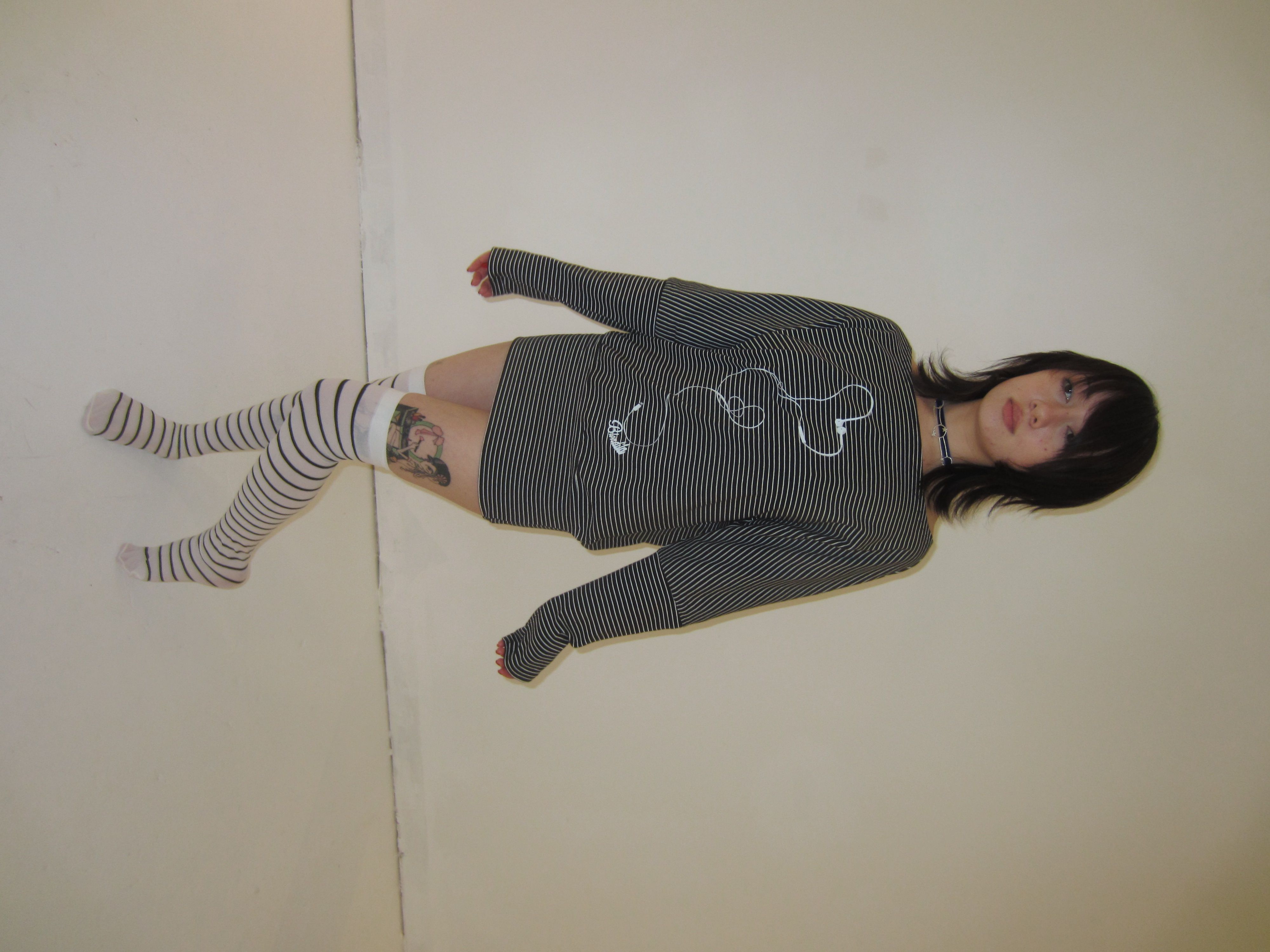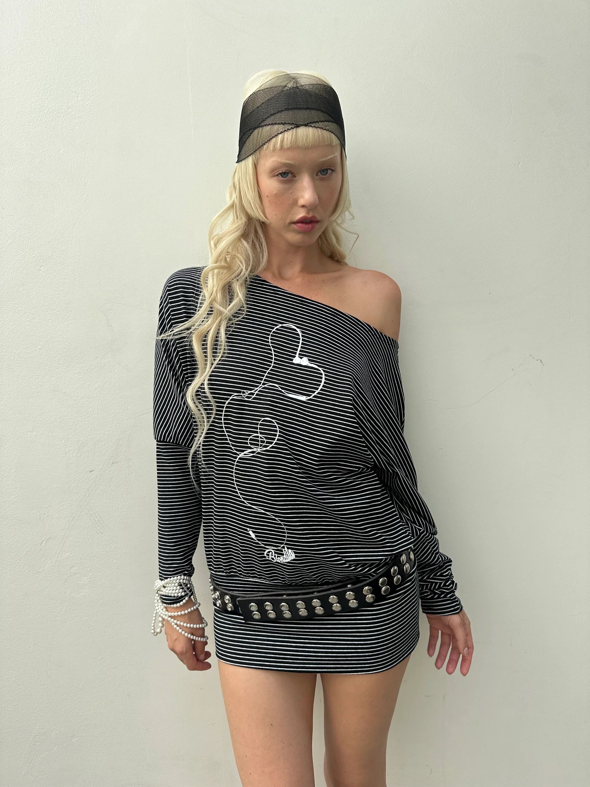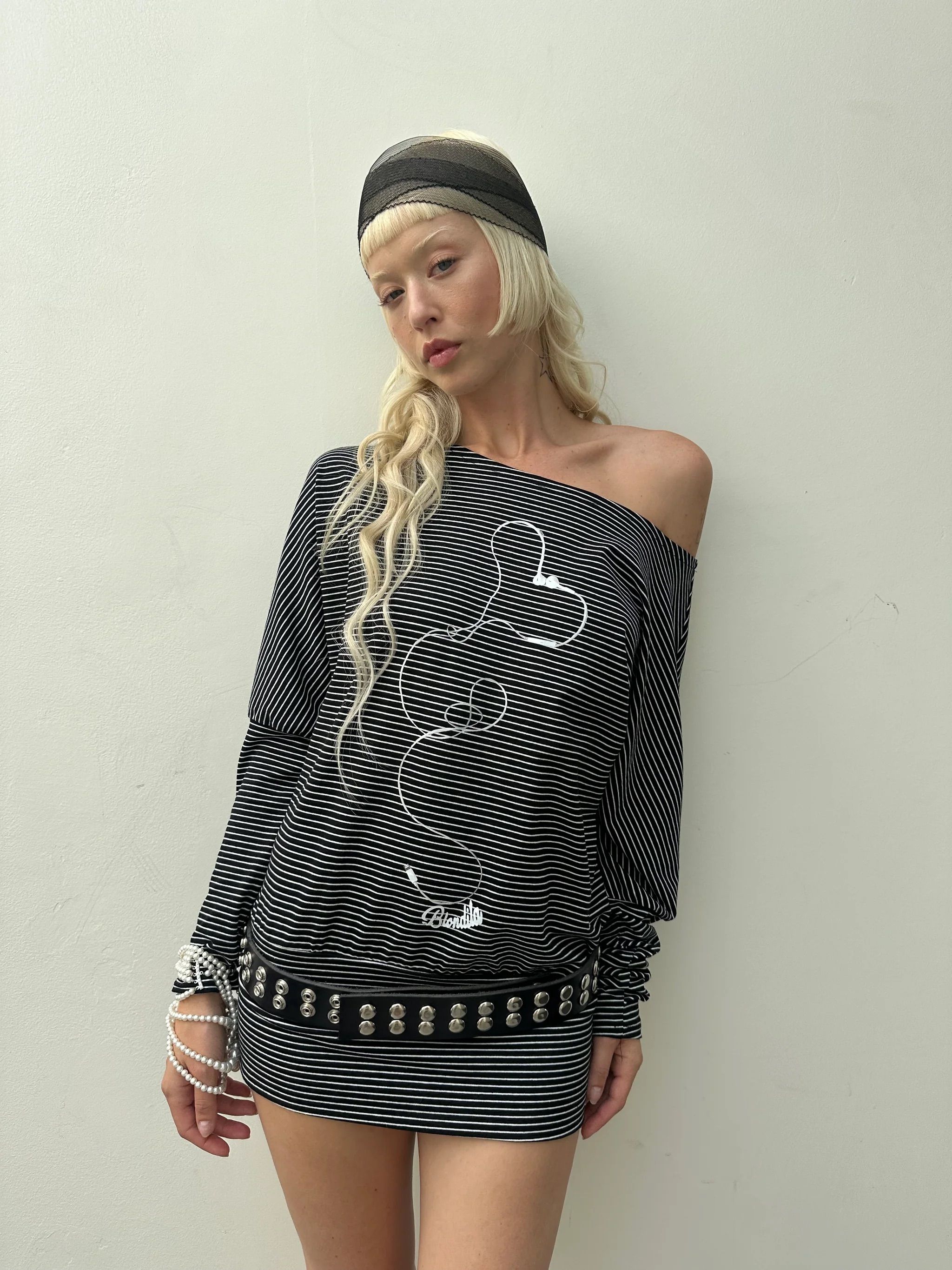 "For this Blondita staple, I literally scanned a pair of headphones and printed them onto bold black-and-white stripes — turning everyday essentials into wearable pop art. The result? A cheeky mini dress that doubles as an oversized top with jeans, made to feel like your own personal soundtrack." - Blondita