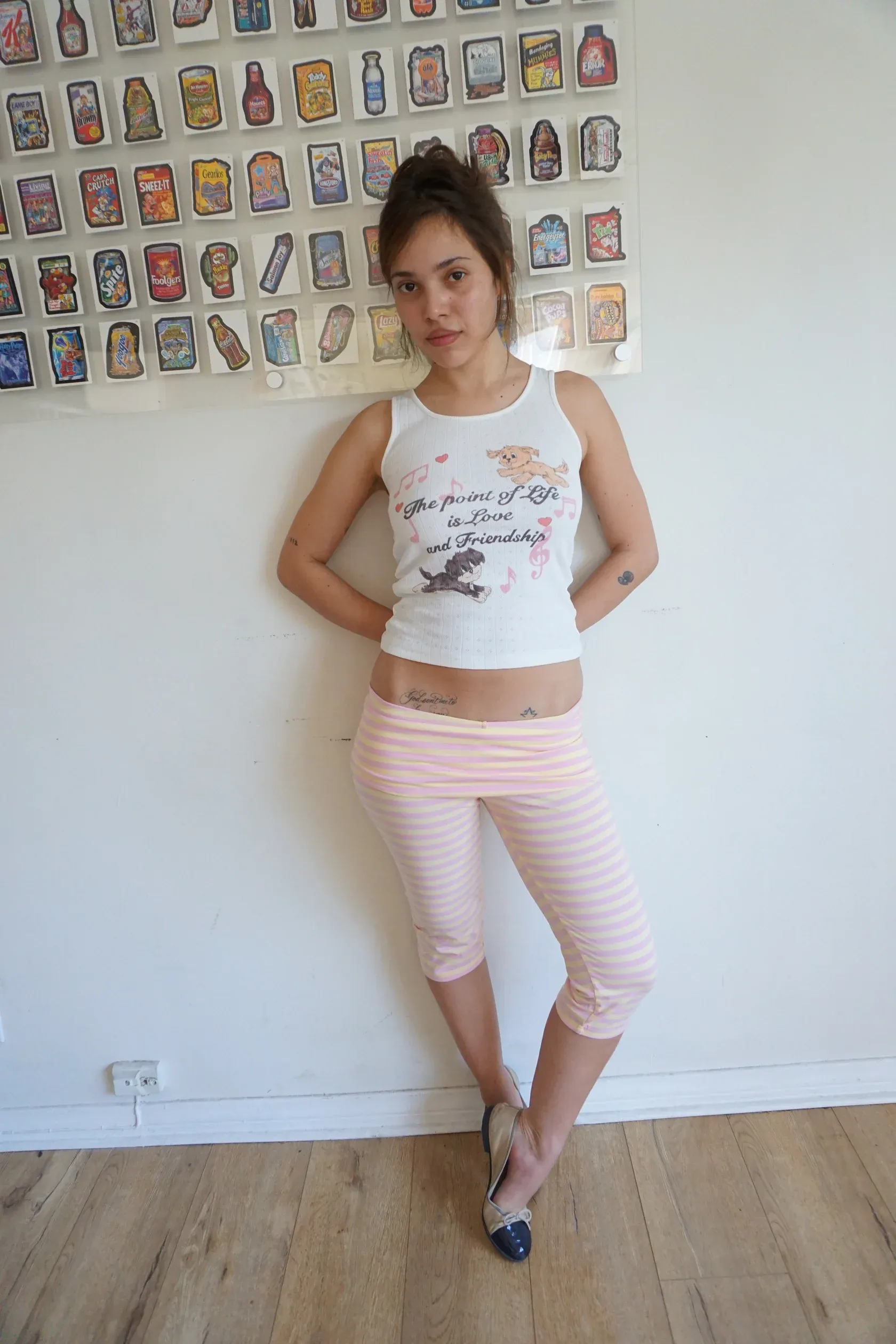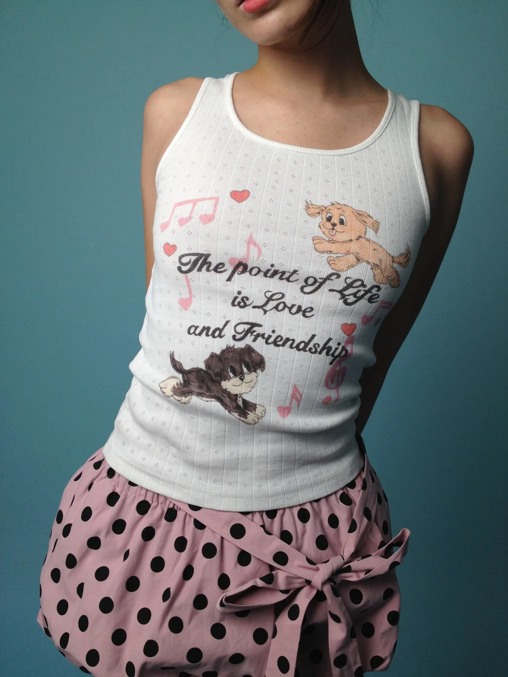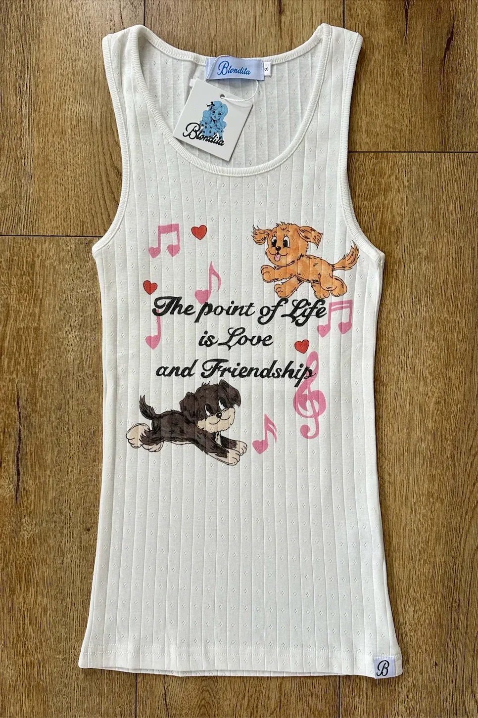 The Love and Friendship Tank is all about warmth, connection, and the kind of sweetness that feels like home. Featuring Blondita’s beloved pups — Ginger and Creature — this white pointelle tank captures the magic of love, loyalty, and everyday nostalgia.