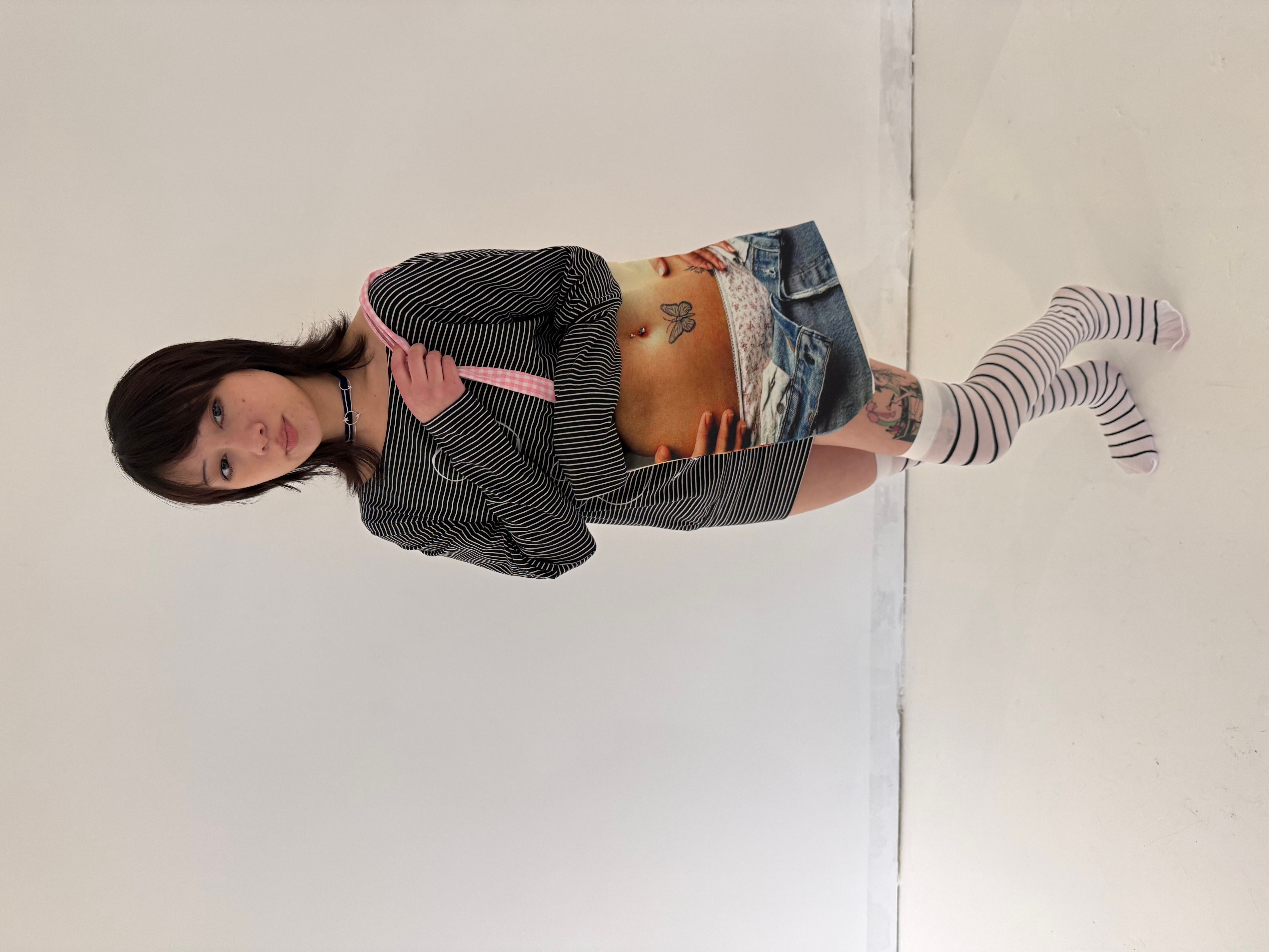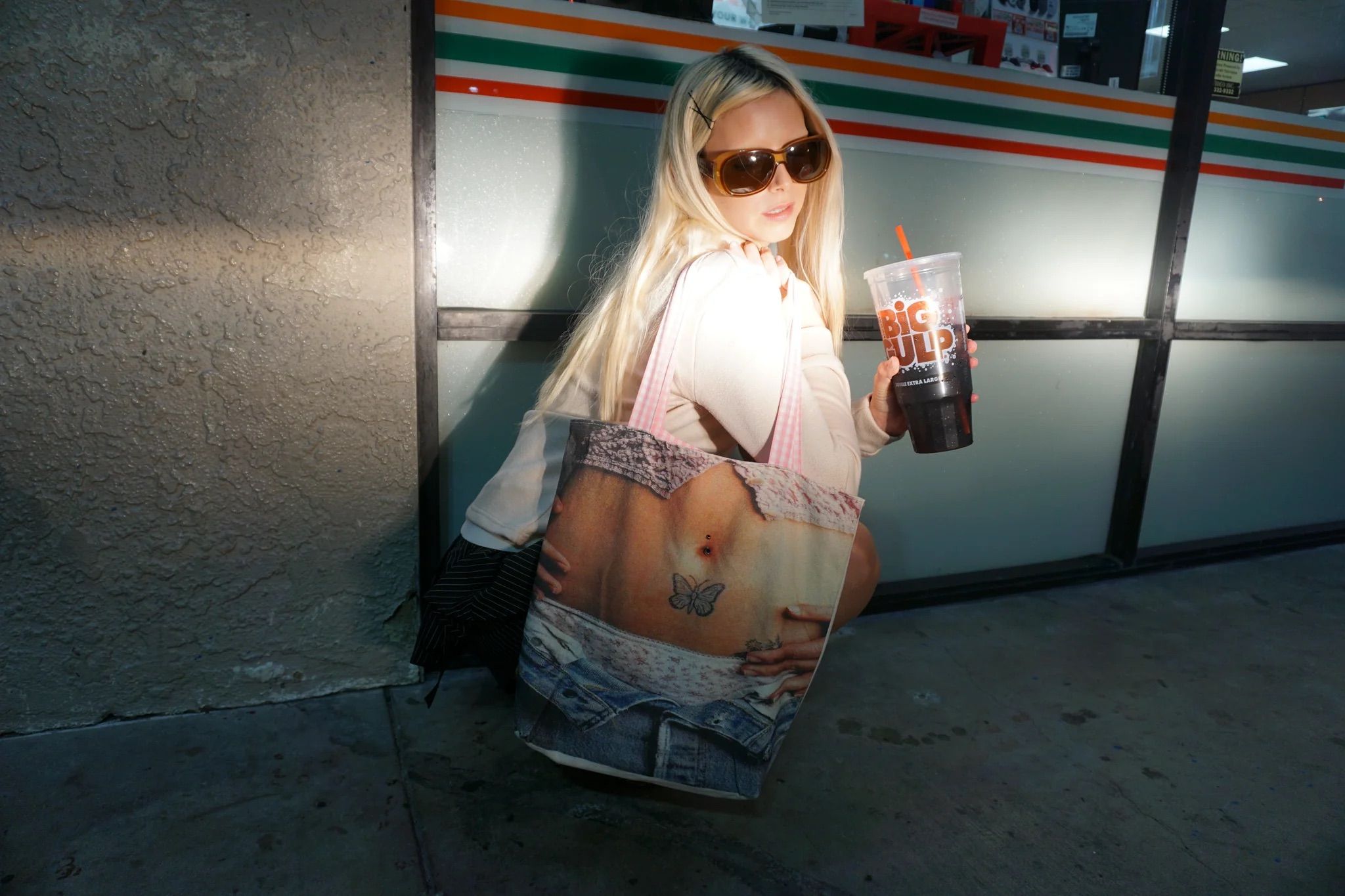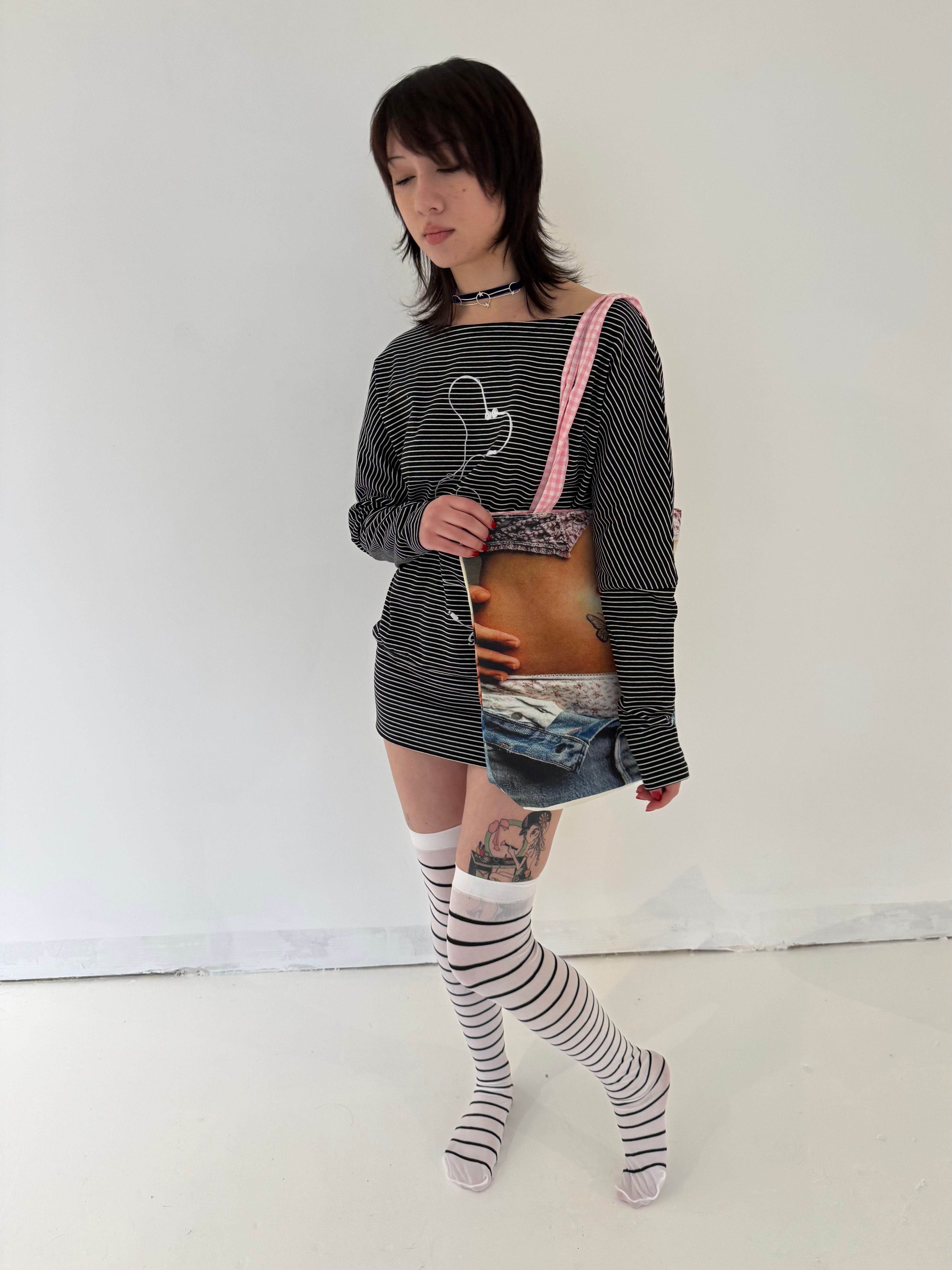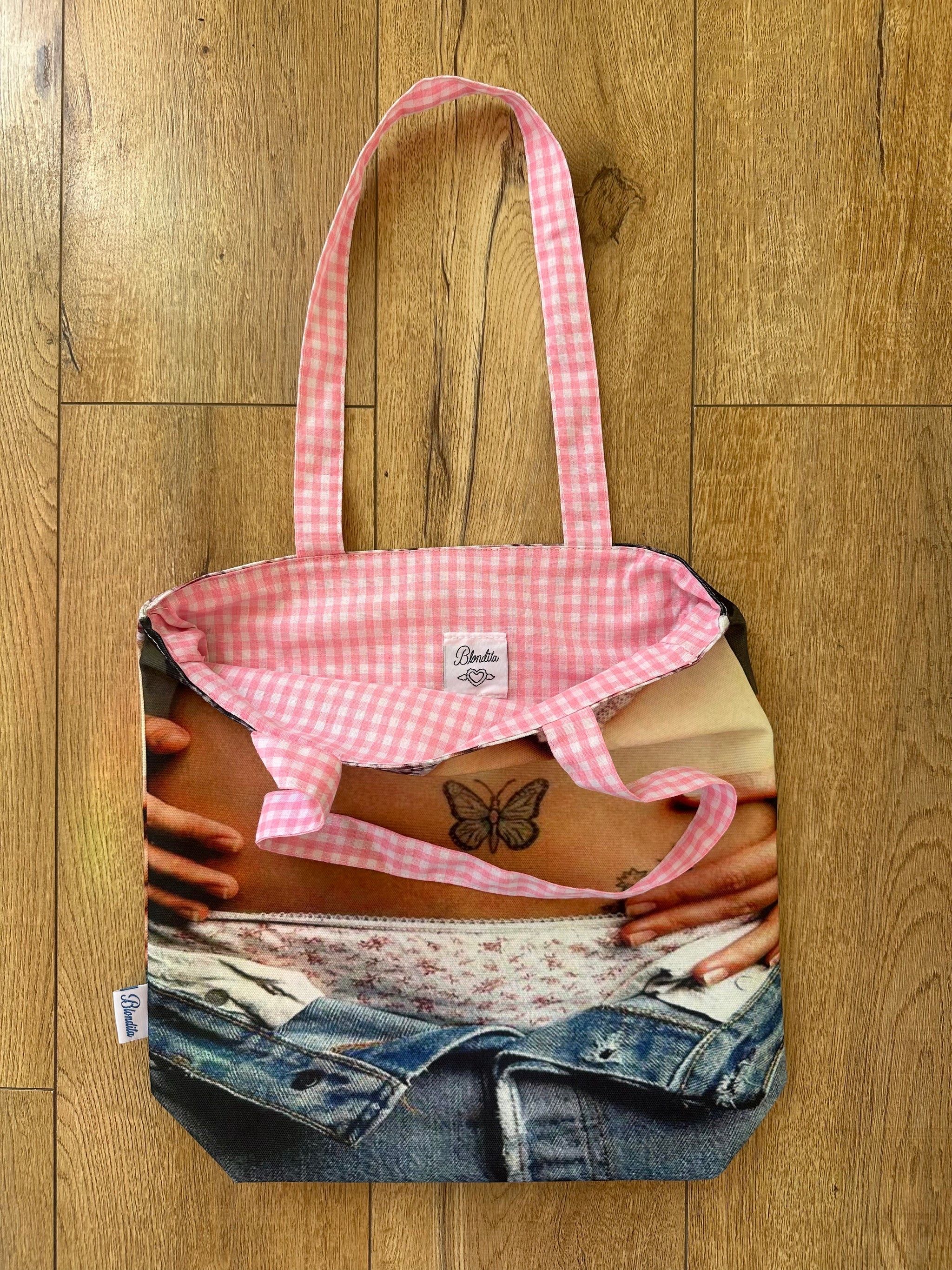 this tote bag features a tiny belly-button piercing — hand-pierced by blondita, just for fun