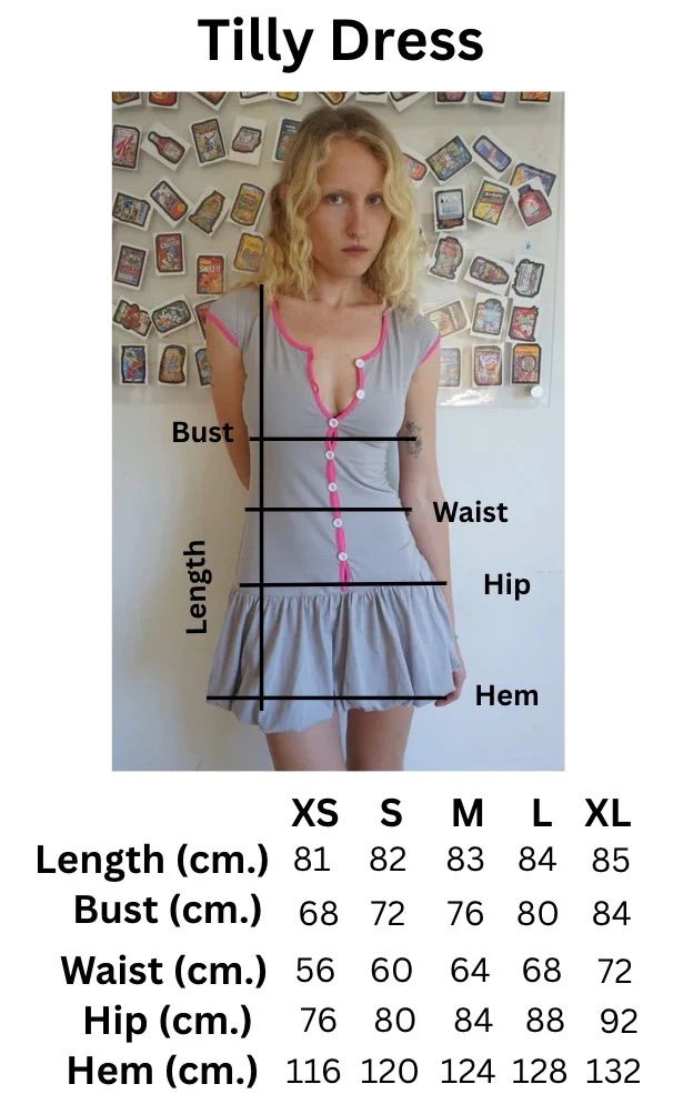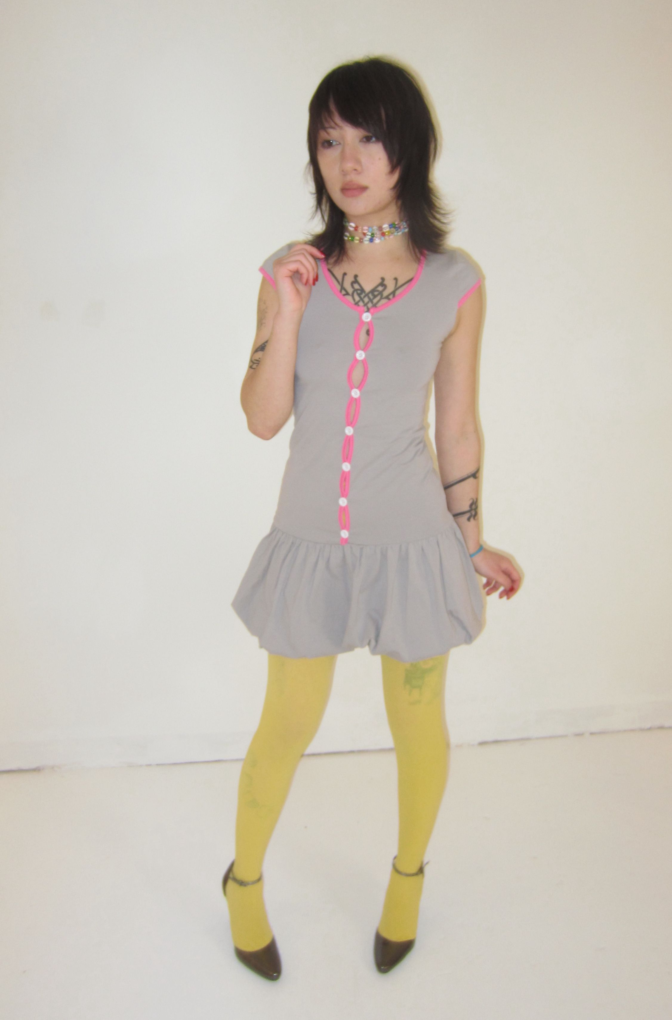 heather grey sweet fitted dress with bright pink trim and delicate button detailing down the front