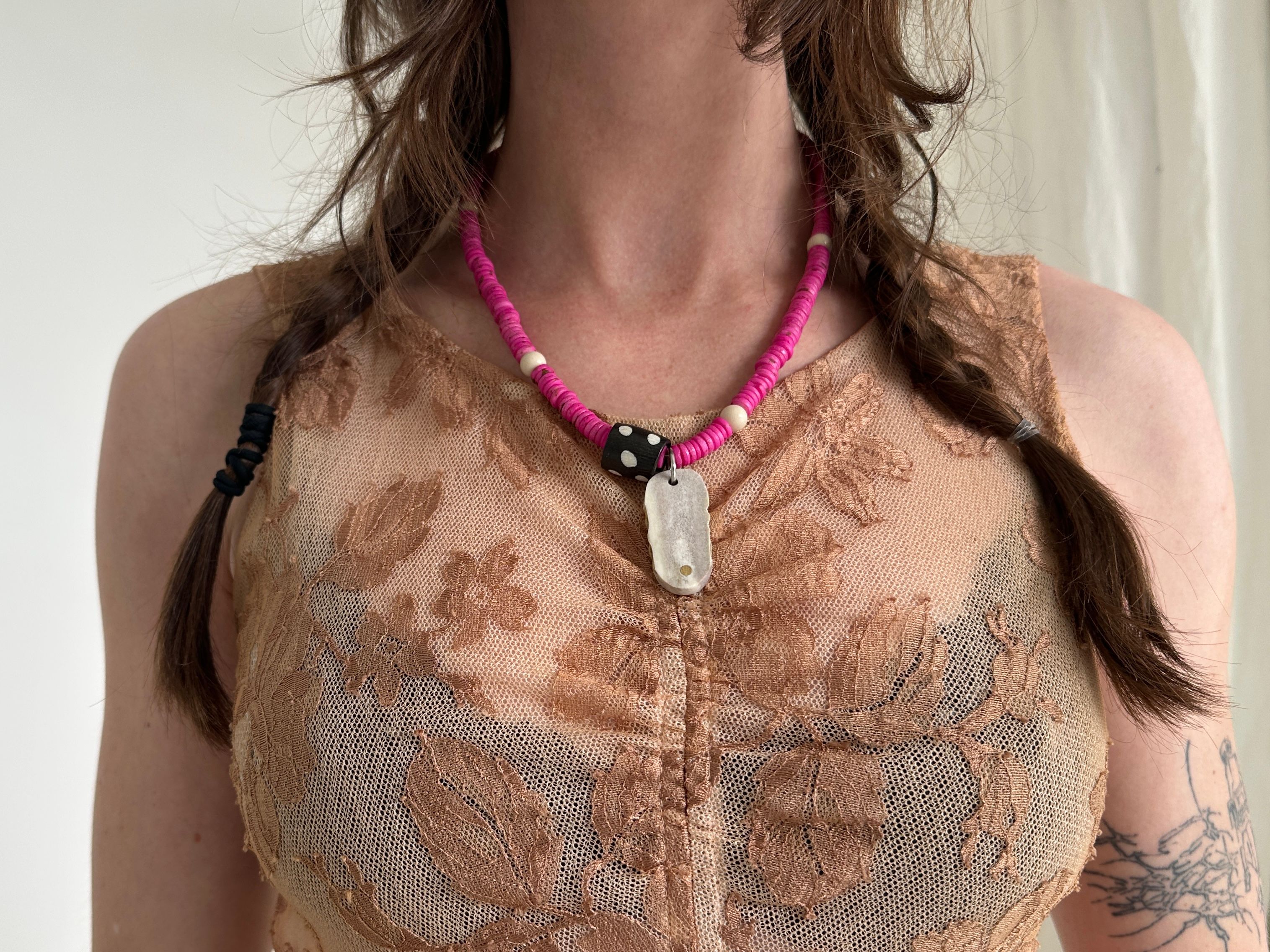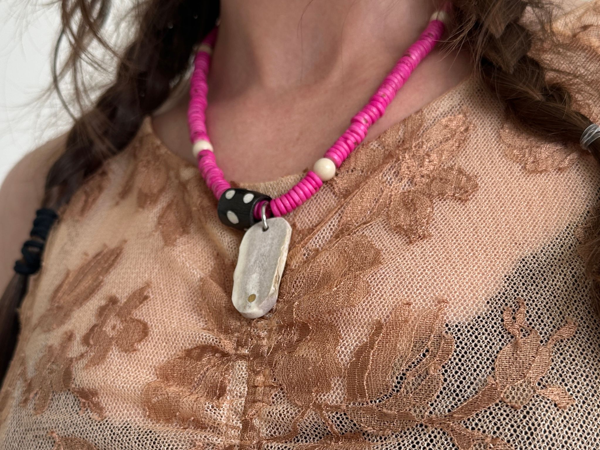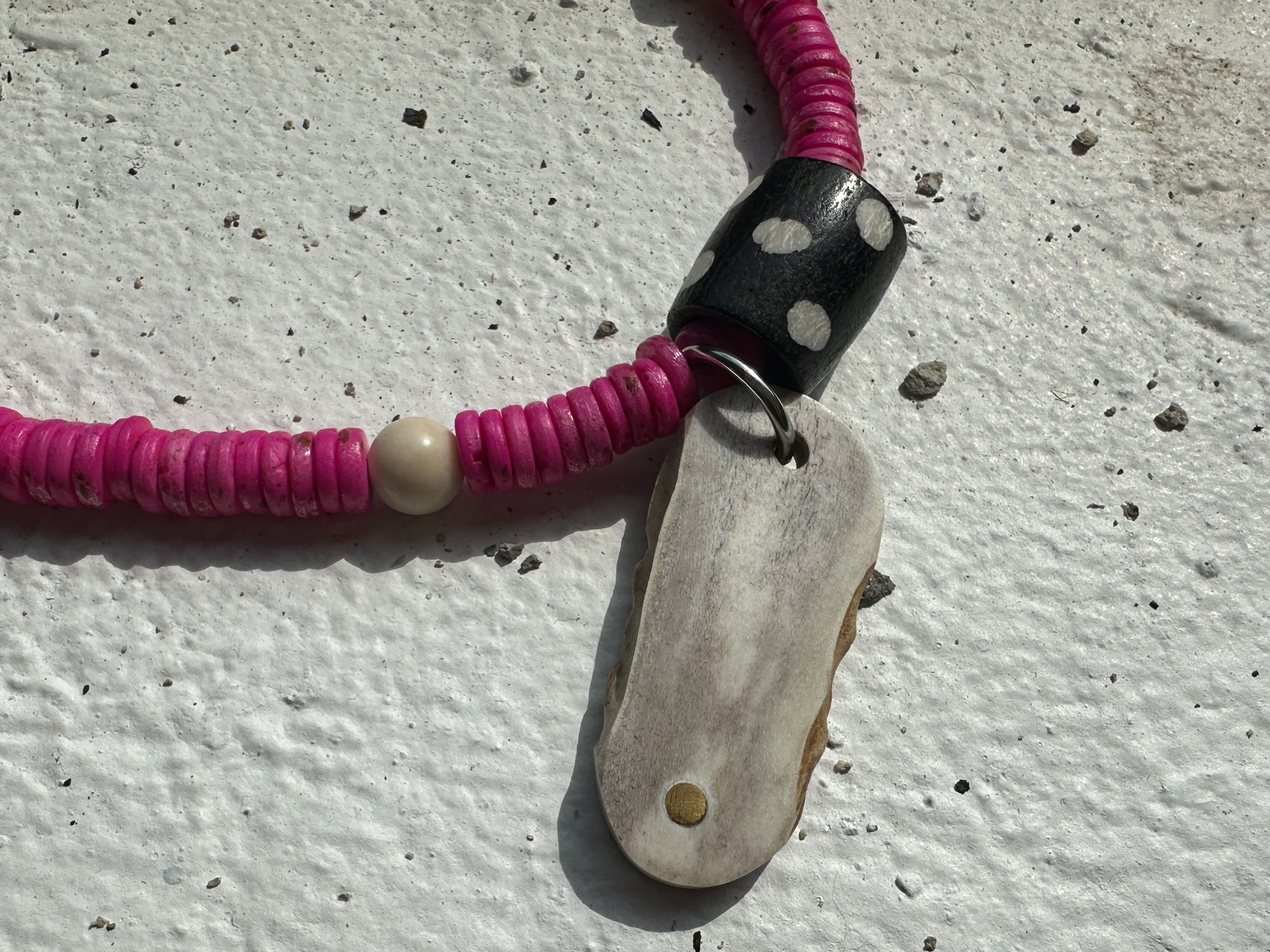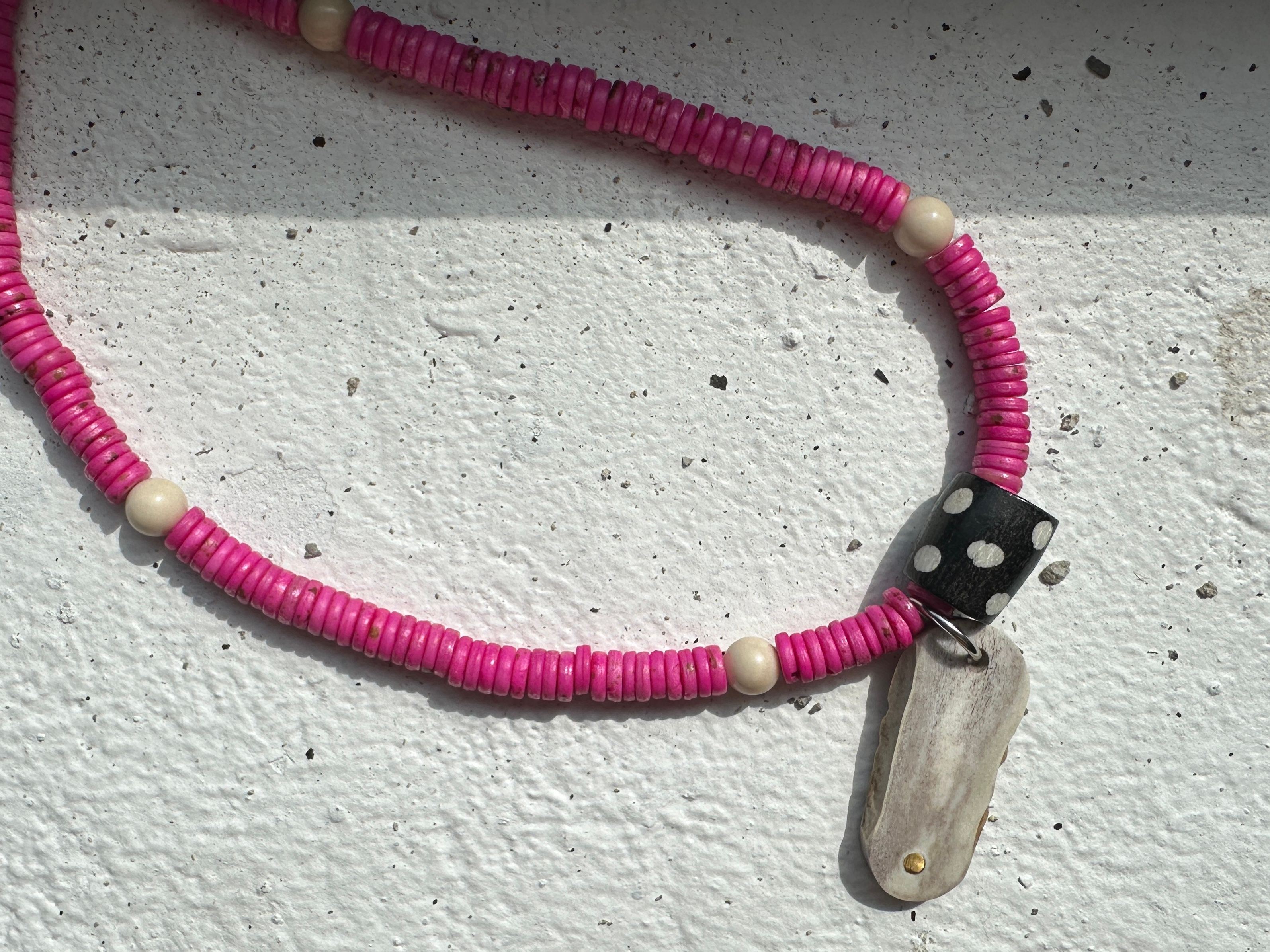 pink dyed bone beads - brass inlayed ethically sourced antler dog tag - river stone beads
