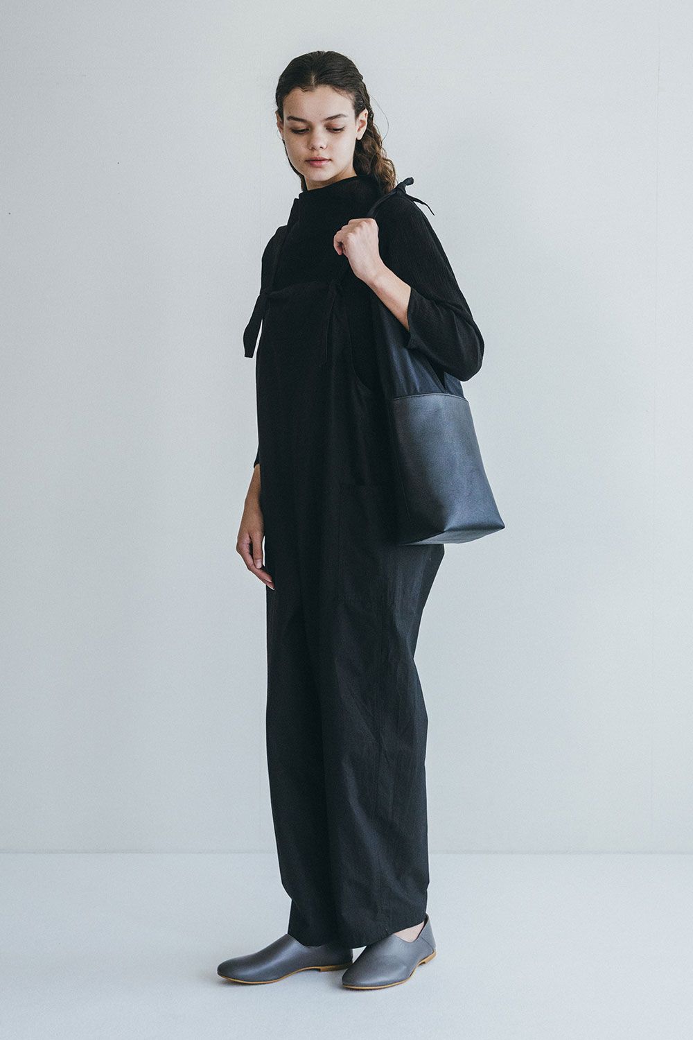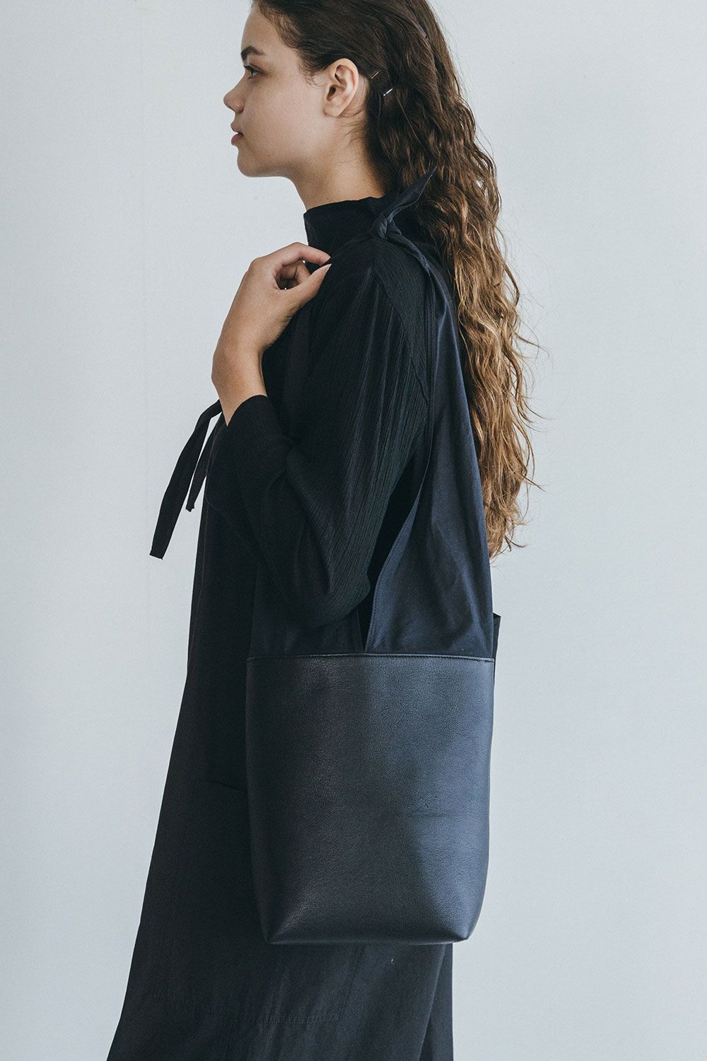 This bucket-shaped bag crafted from cotton and black leather with a tie top handle