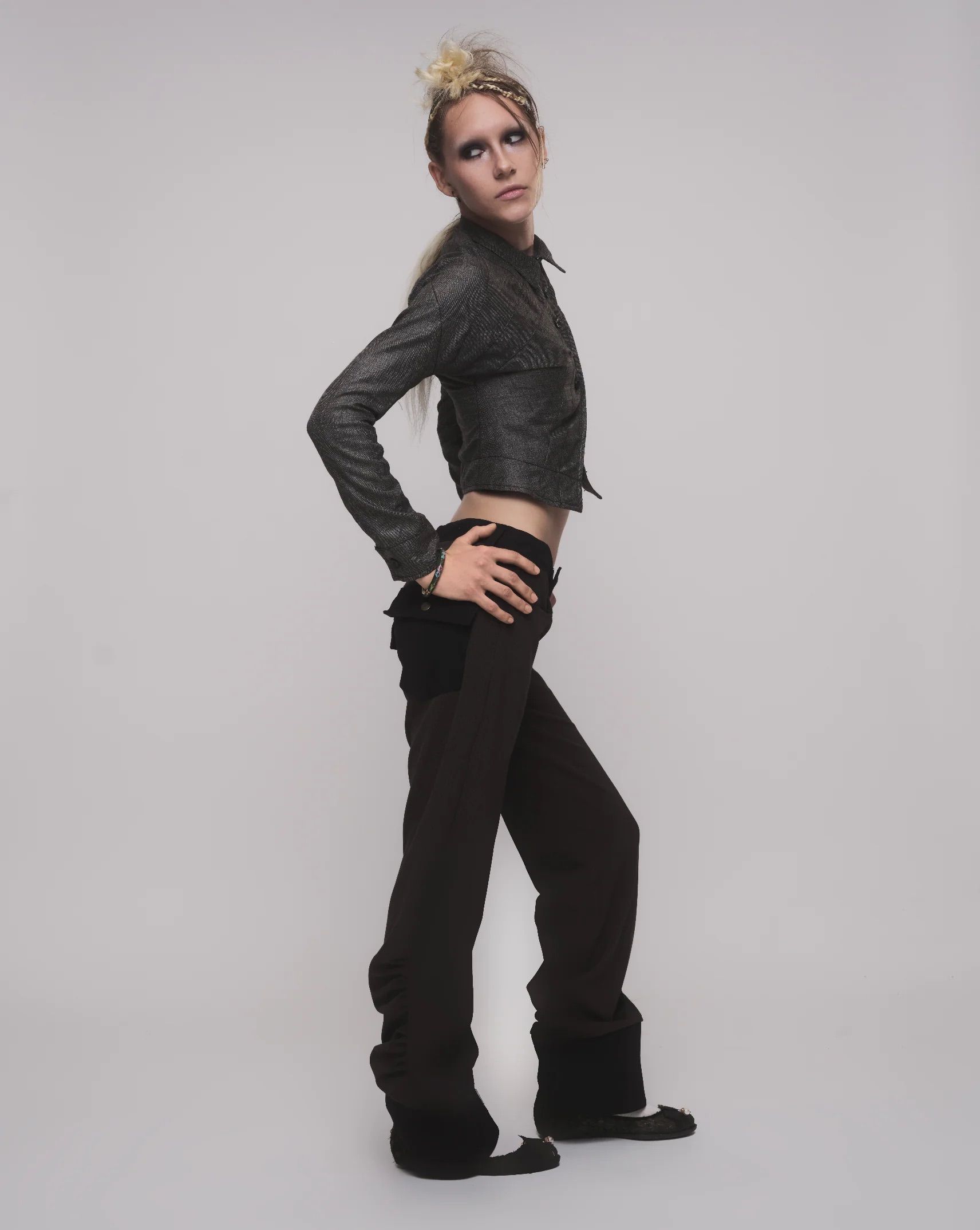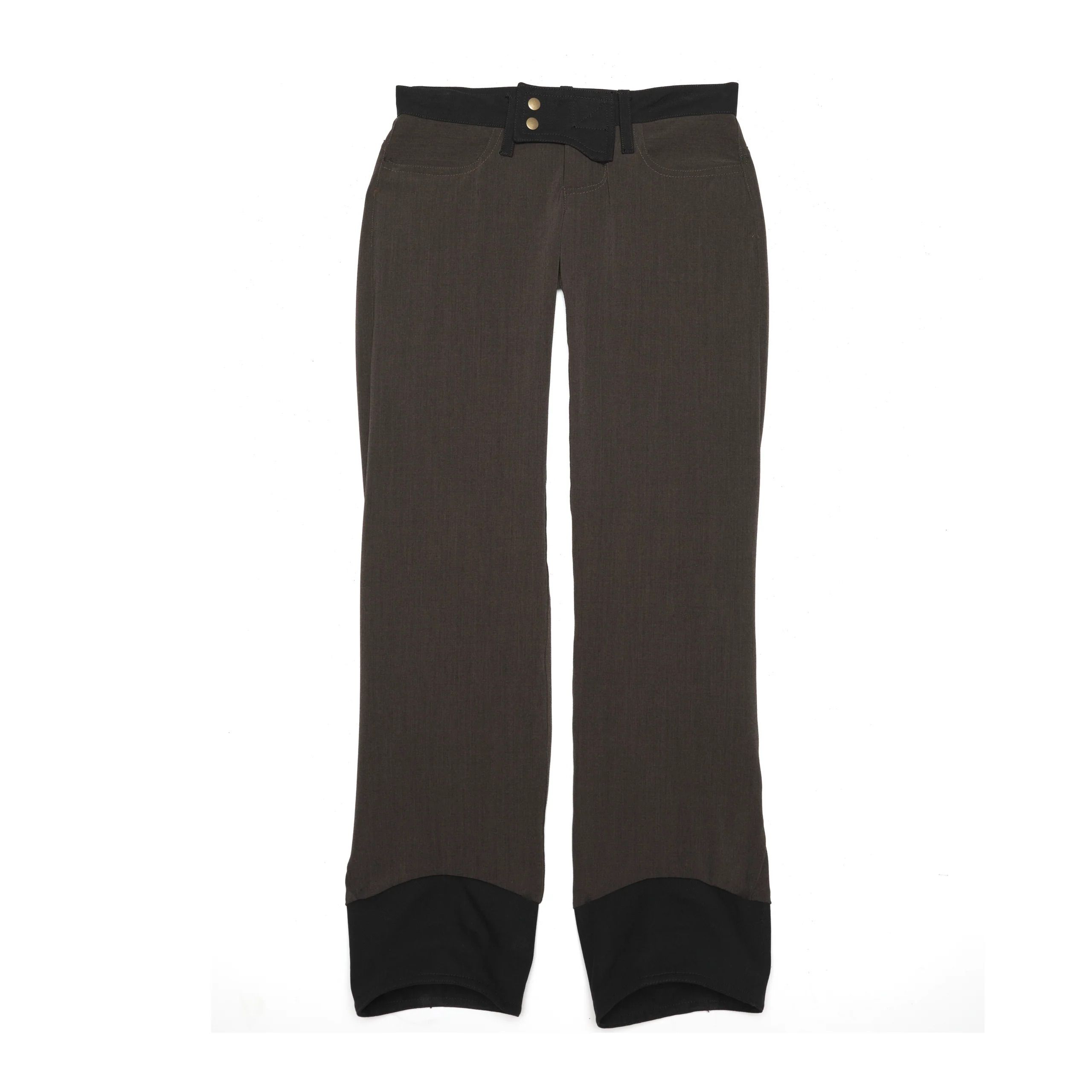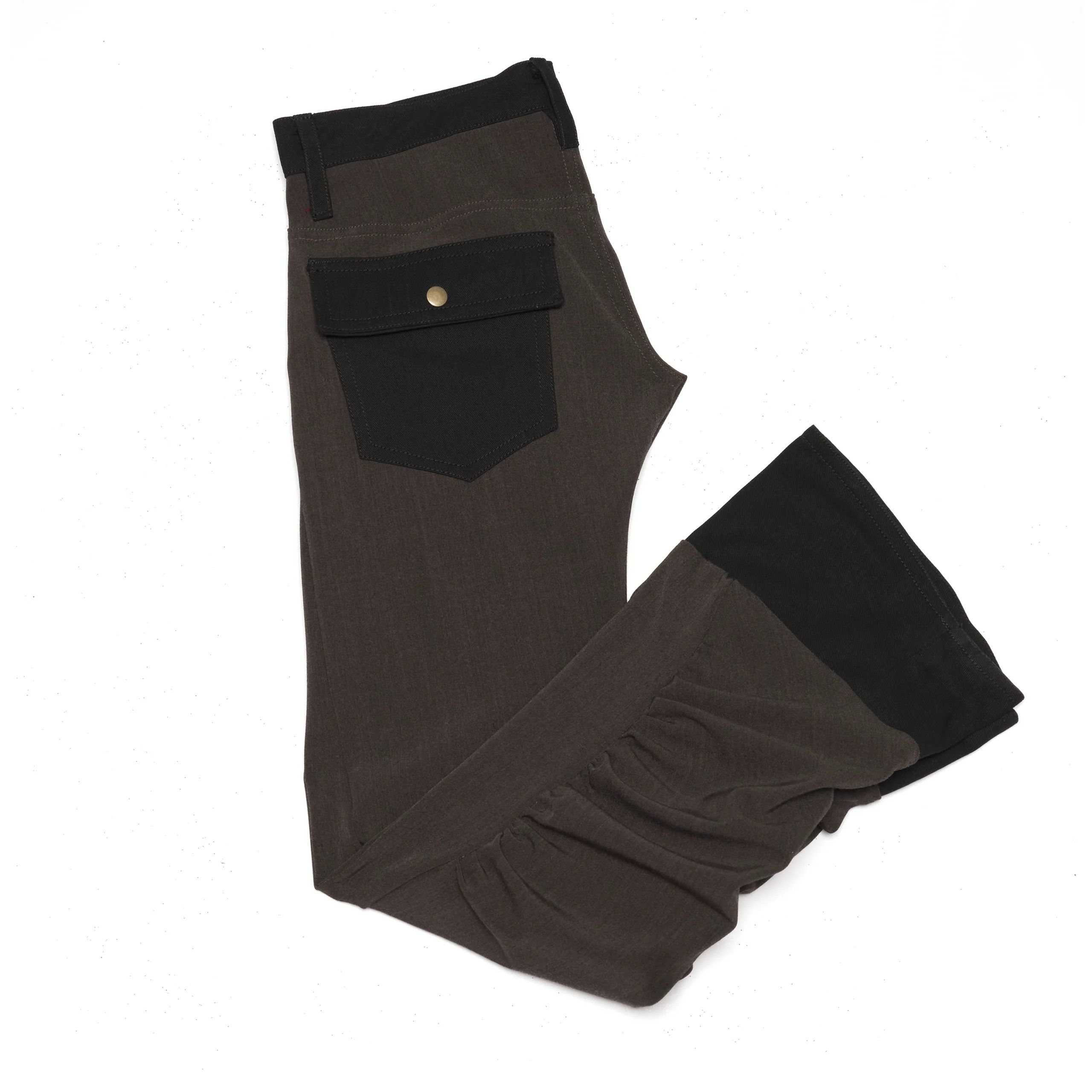 LOWRISE SOFT TWILL & MEDIUM WEIGHT TWILL COMBINATION TROUSER WITH GATHERED LEG, SNAP FLY DETAIL, UNIFORM BACK POCKETS AND WIDE CUFF HEM. MODEL IS 5'9" AND WEARS SIZE S