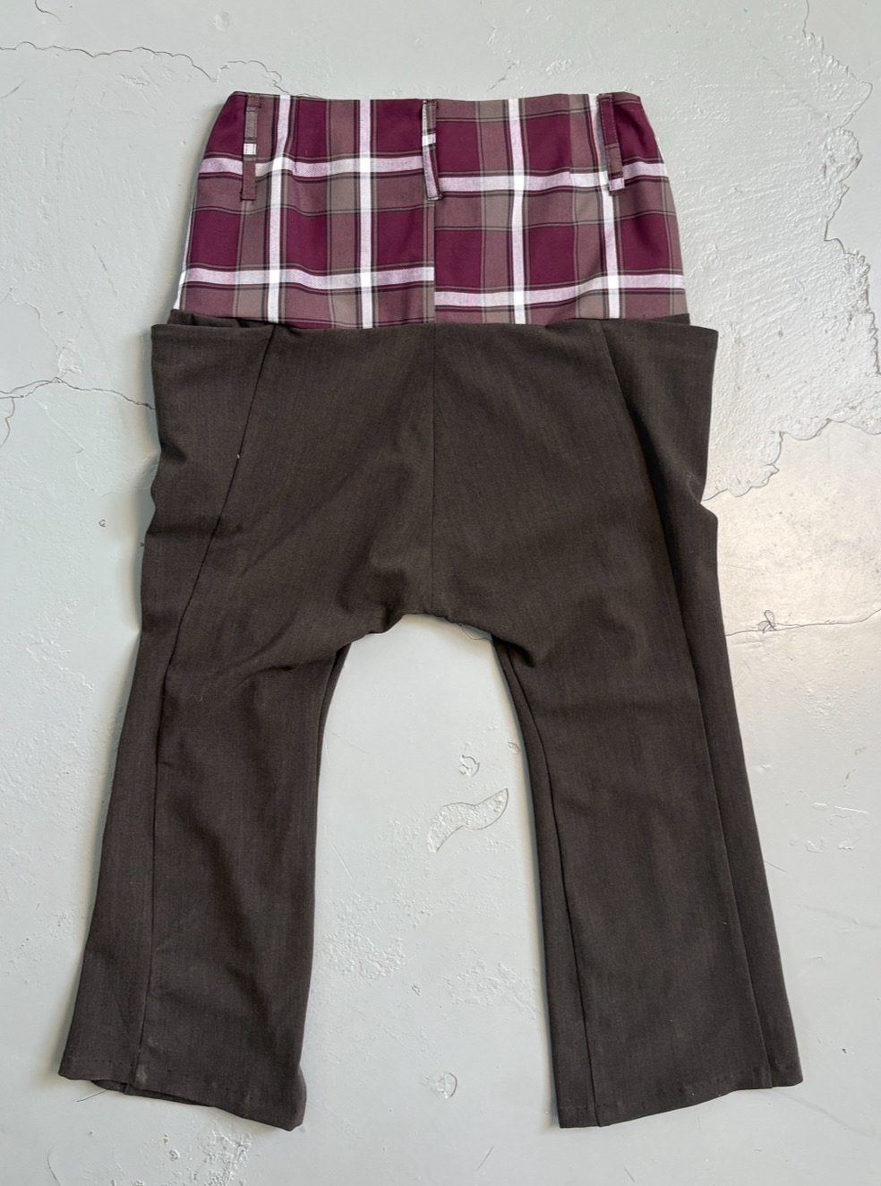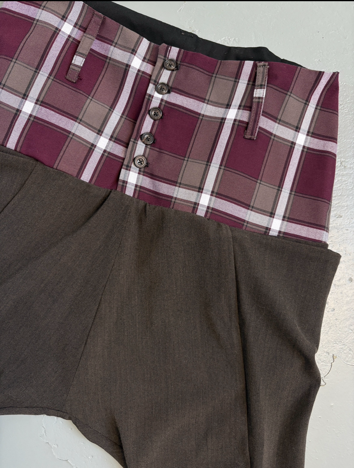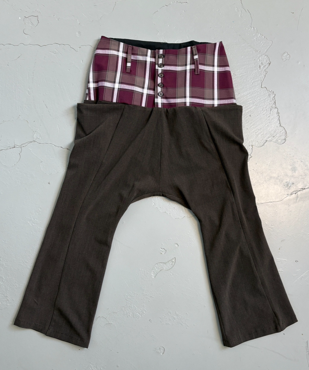 RELAXED DENIM & WOOL HAREM PANTS WITH CONTRAST WIDE WAISTBAND, BUTTON FLY AND SIDE POCKETS. MID TO LOW RISE, SLIM AND BELLED BOTTOM TROUSER FIT