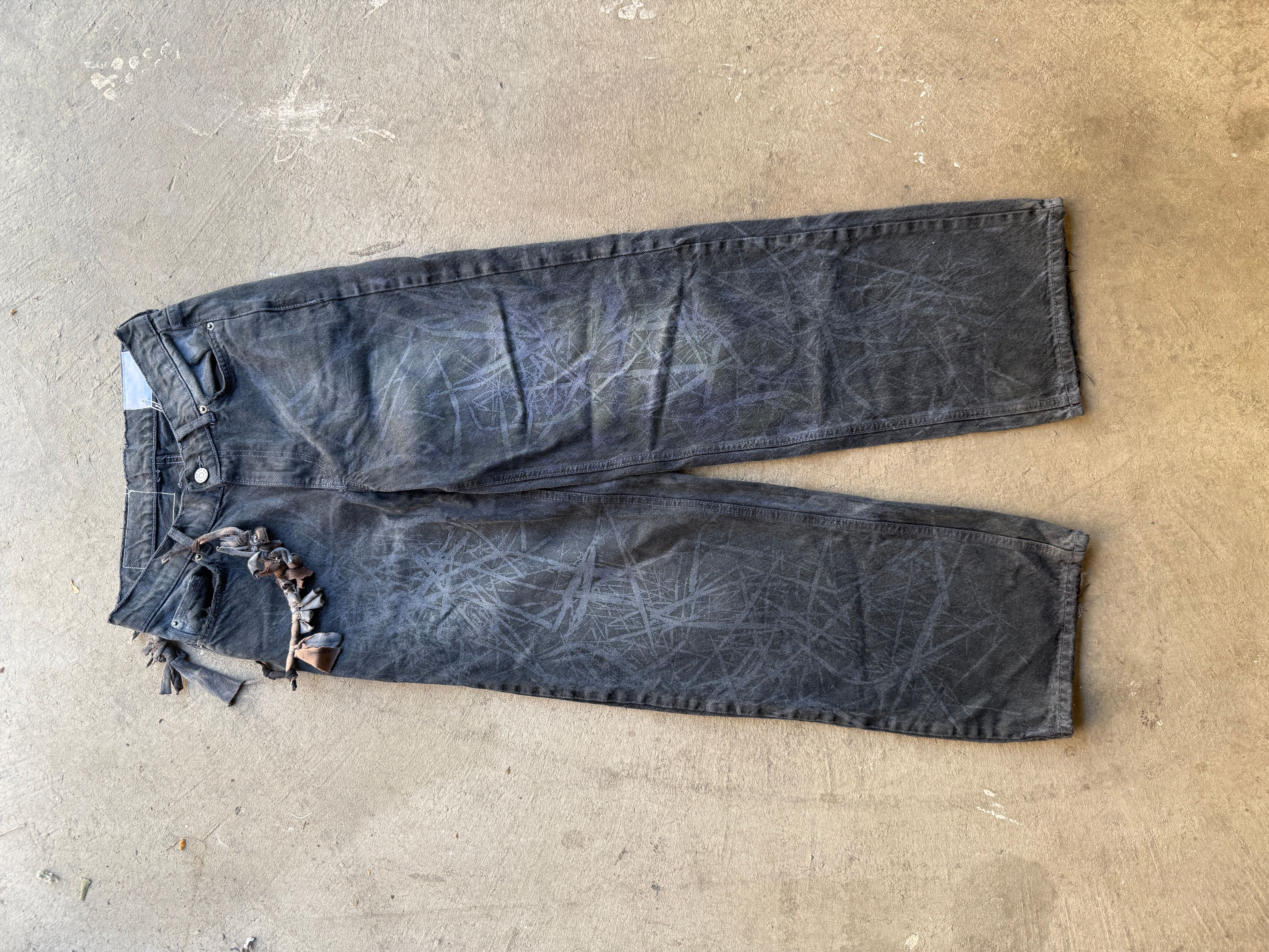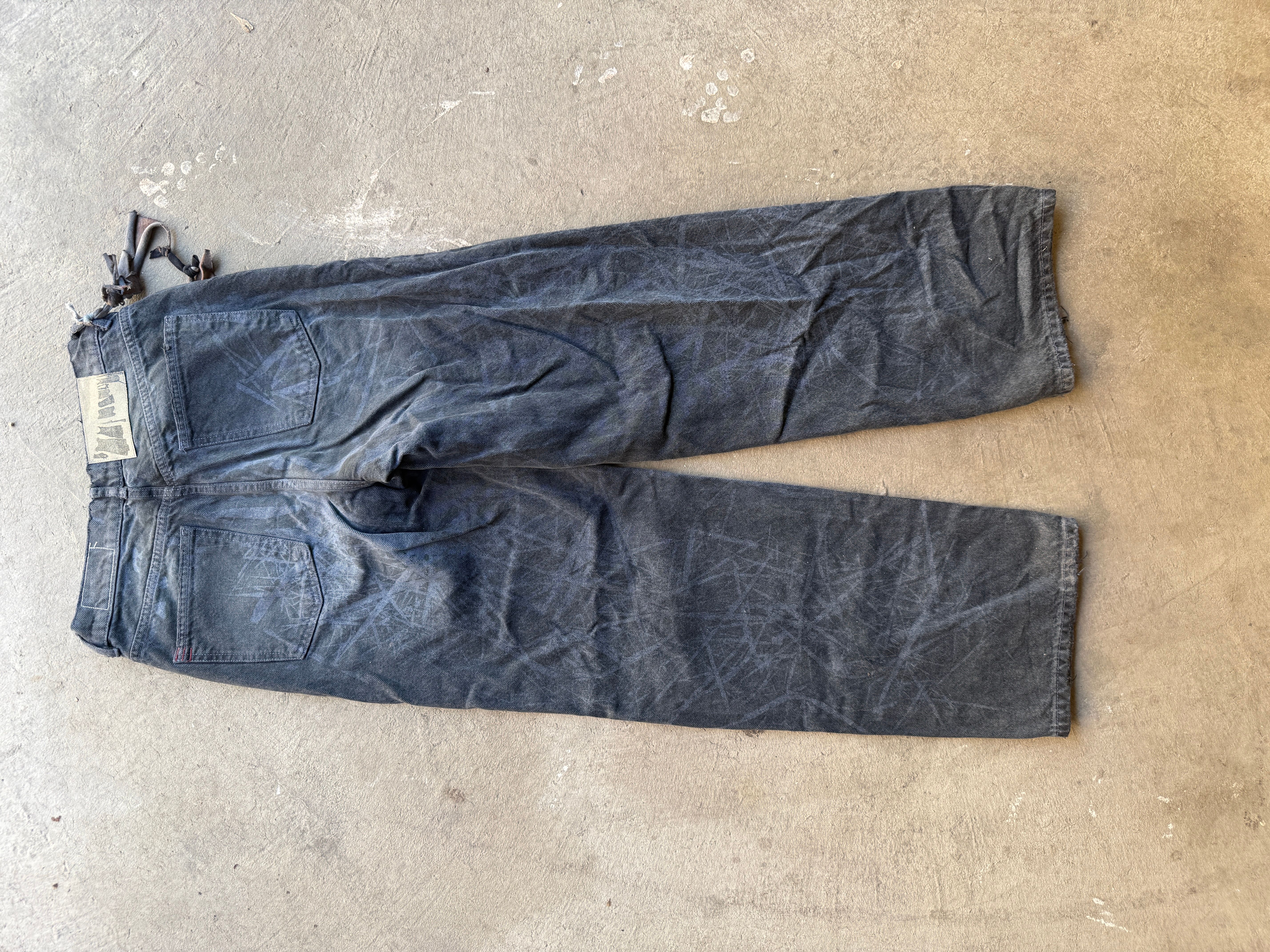 reclaimed vintage surplus distressed denim allover printed with textile dye and a grass resist print.