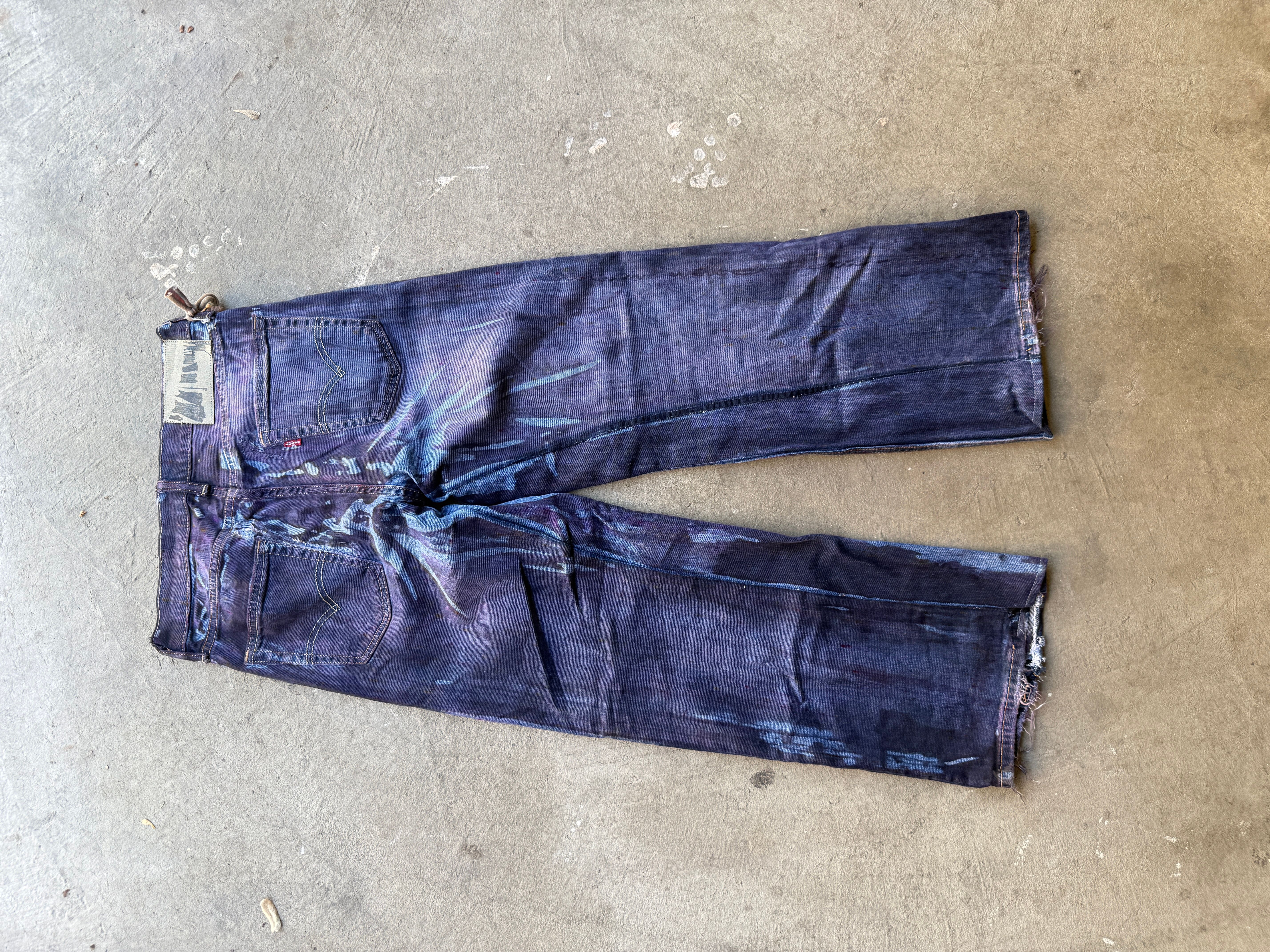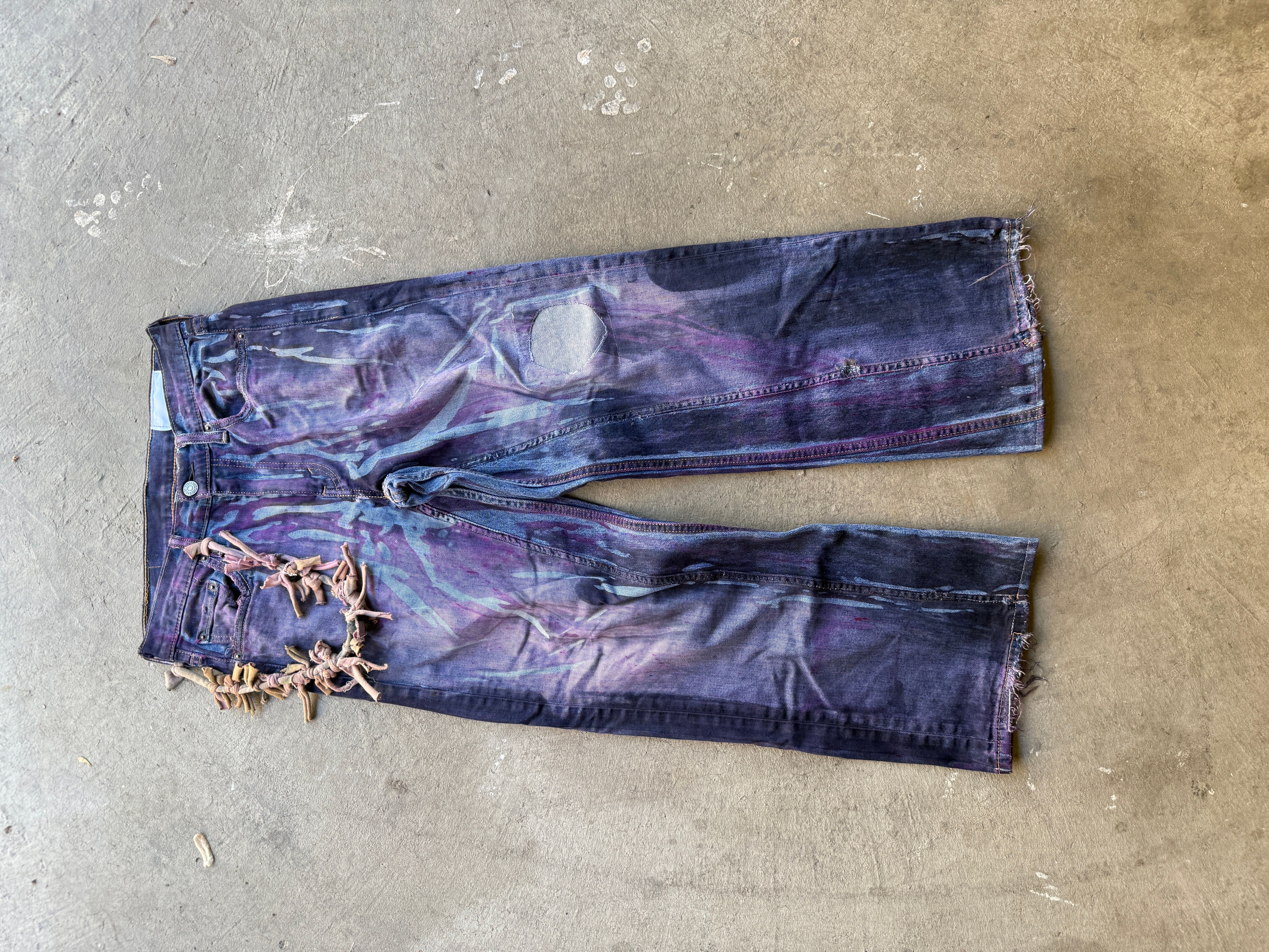 reclaimed vintage surplus distressed denim allover printed with copper, aluminum, and iron alongside textile dye.