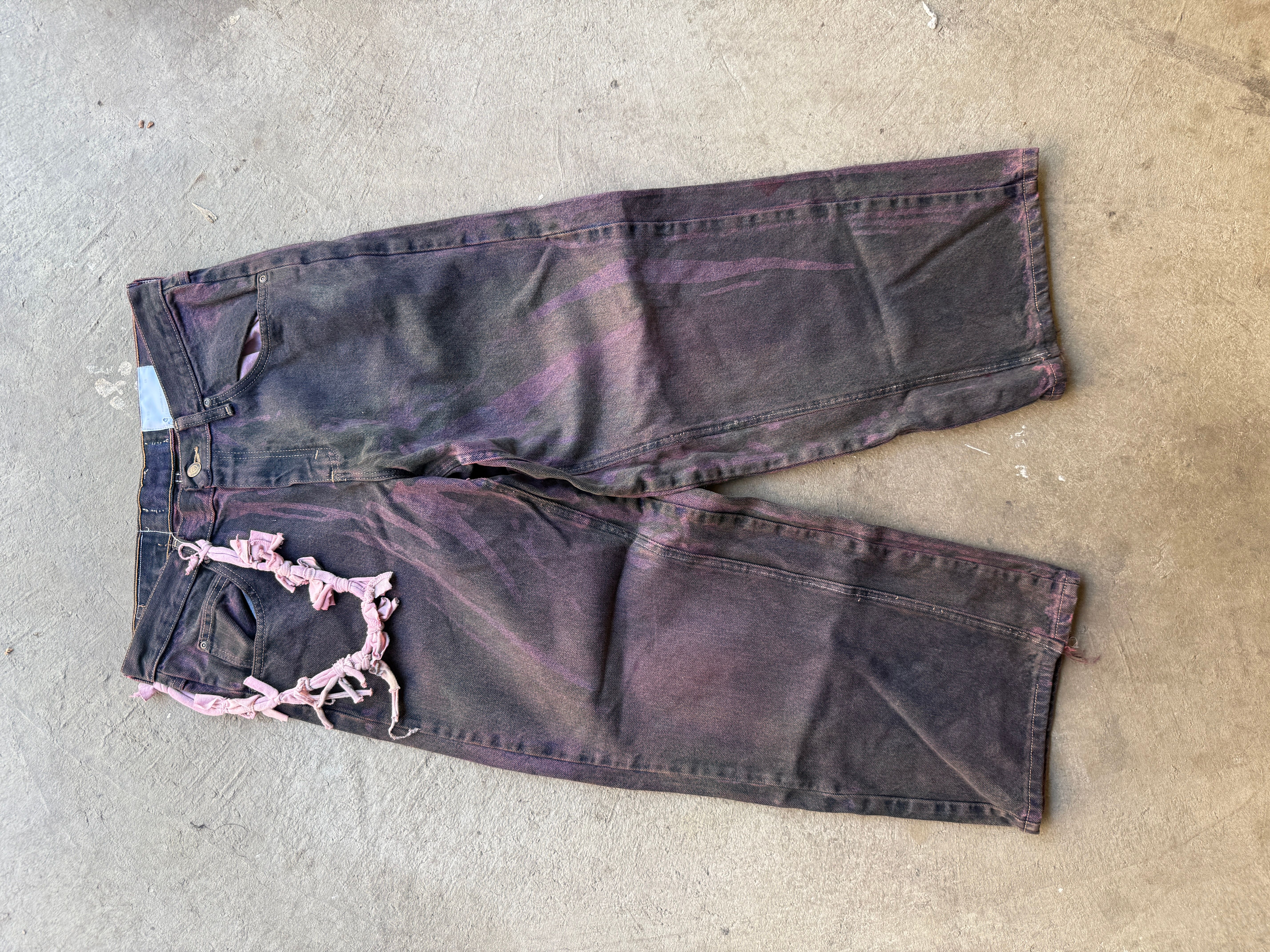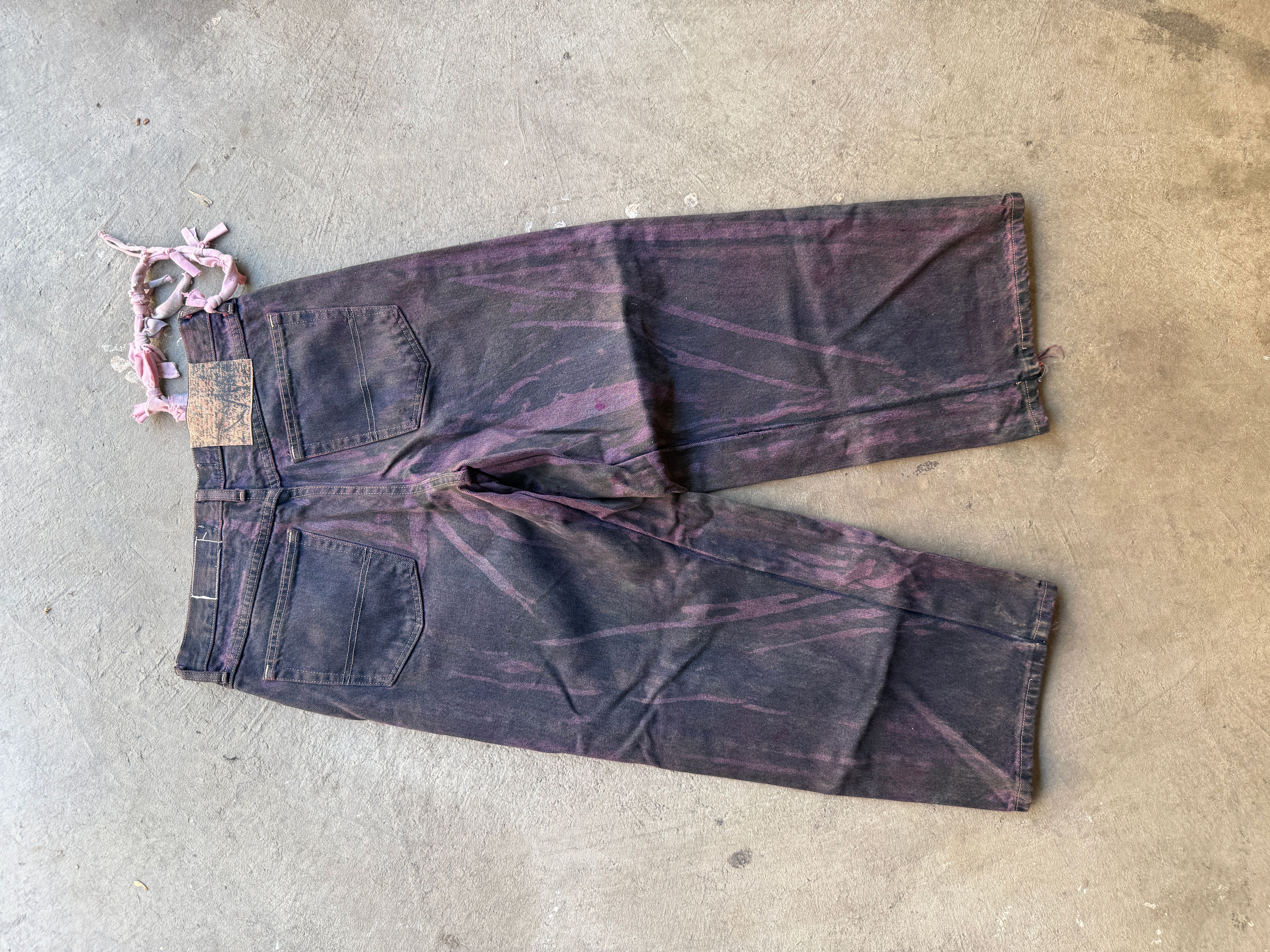 reclaimed vintage surplus distressed denim allover printed with copper, aluminum, and iron alongside textile dye.