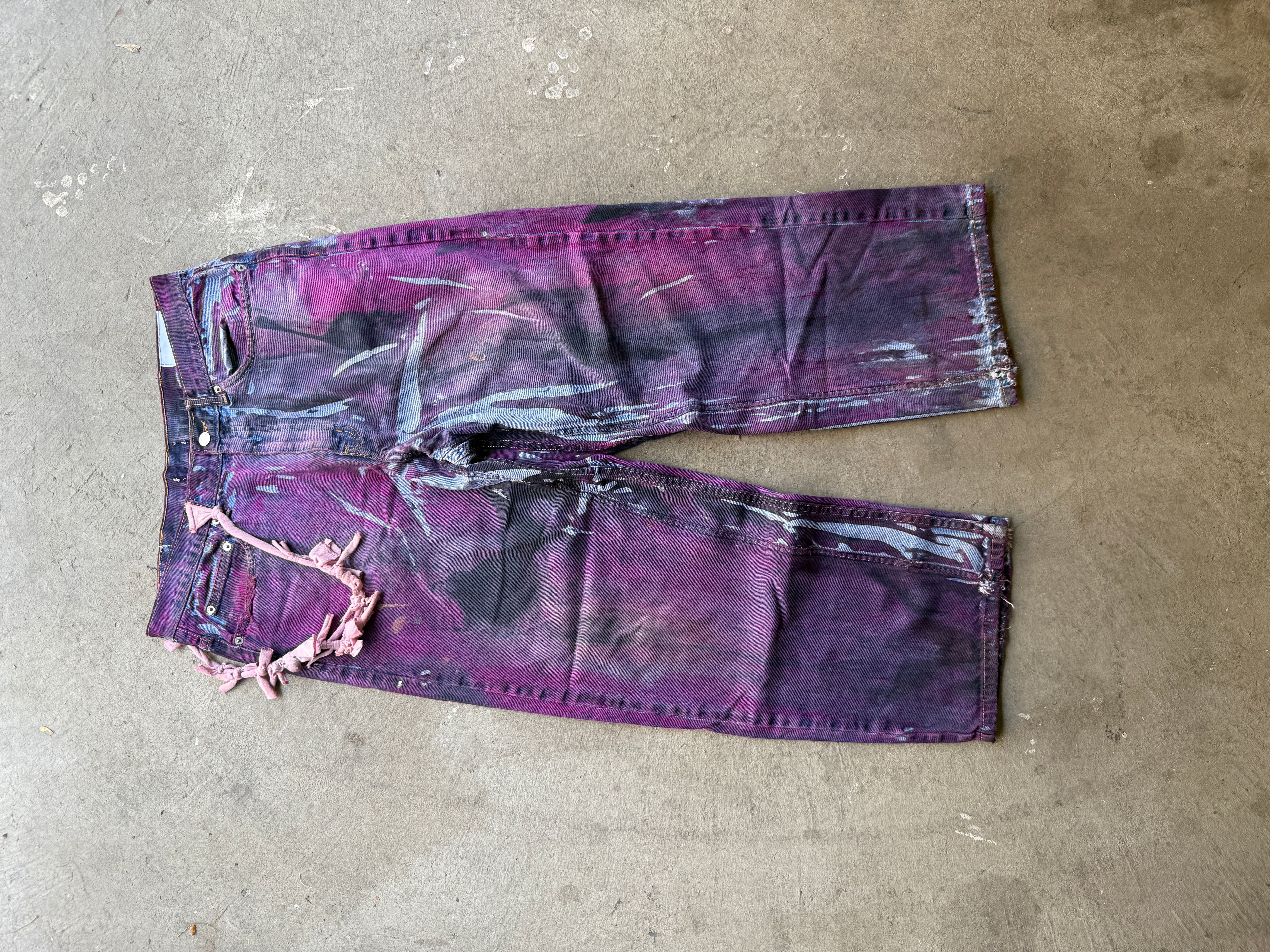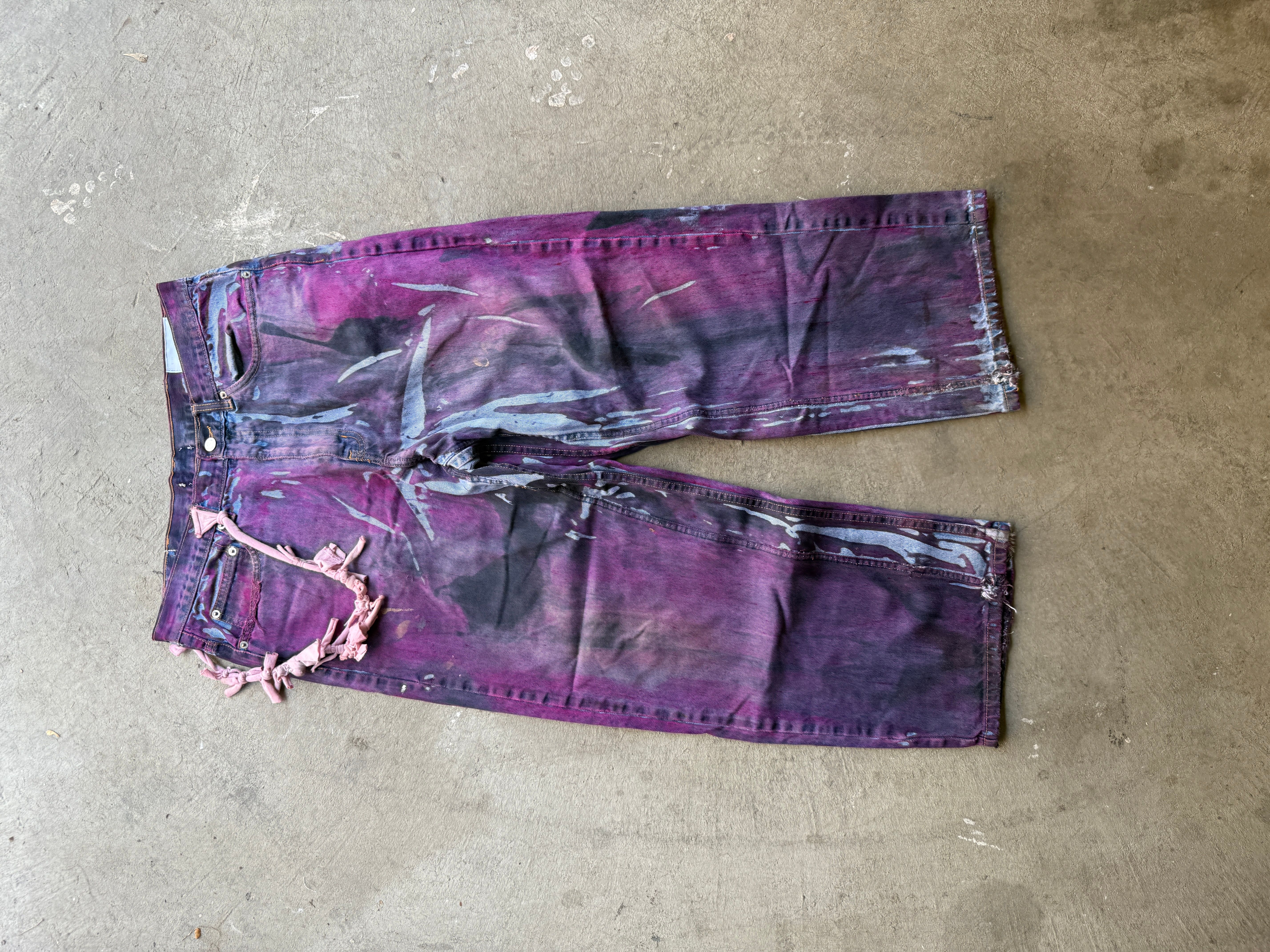 reclaimed vintage surplus distressed denim allover printed with copper, aluminum, and iron alongside textile dye.