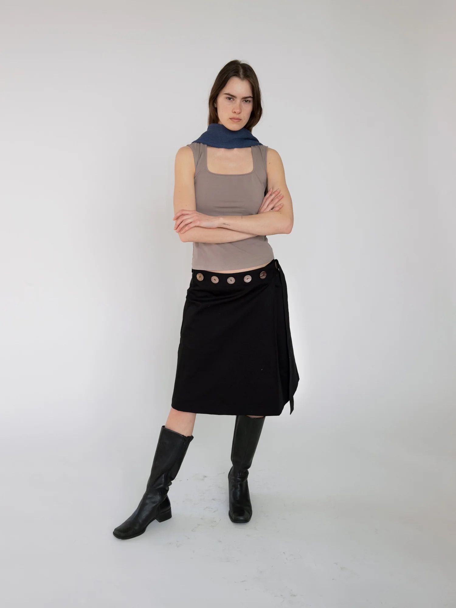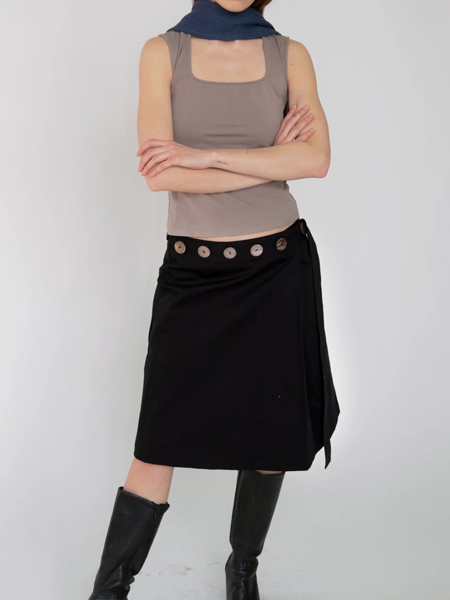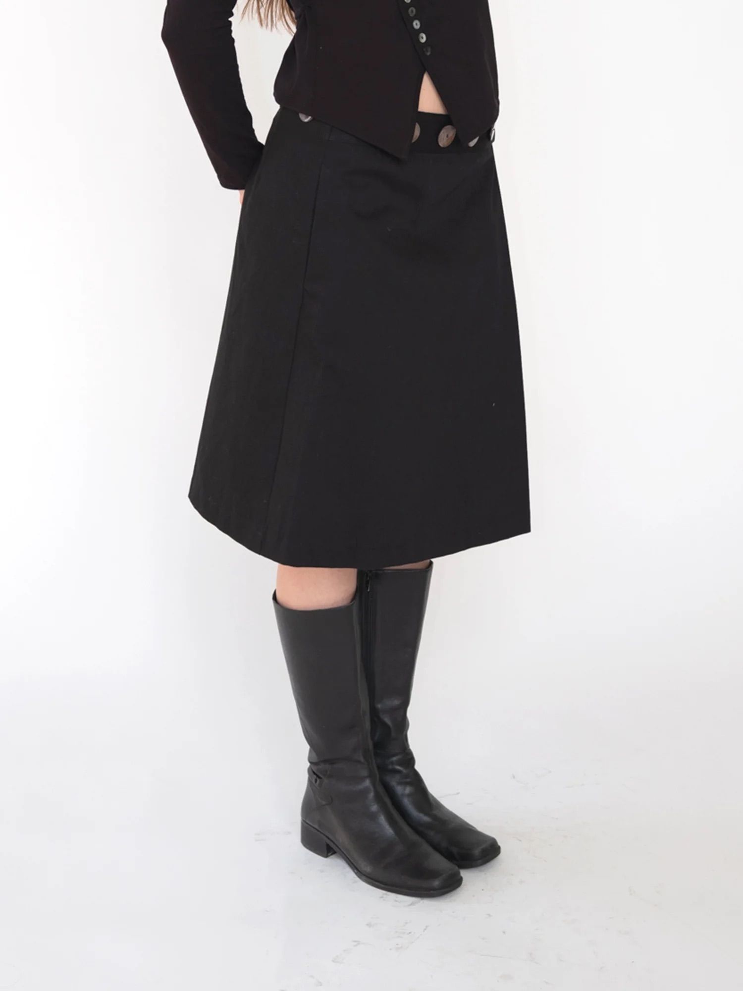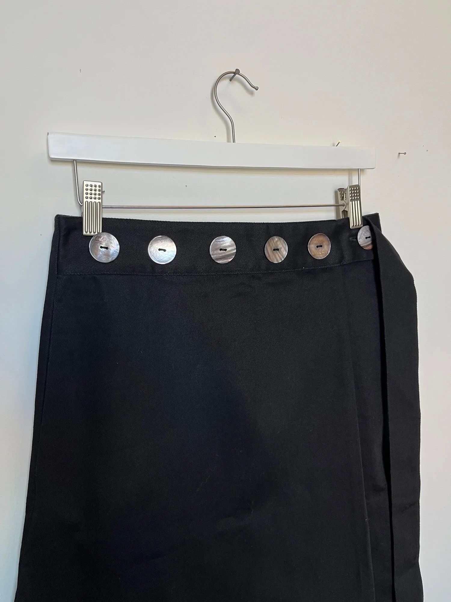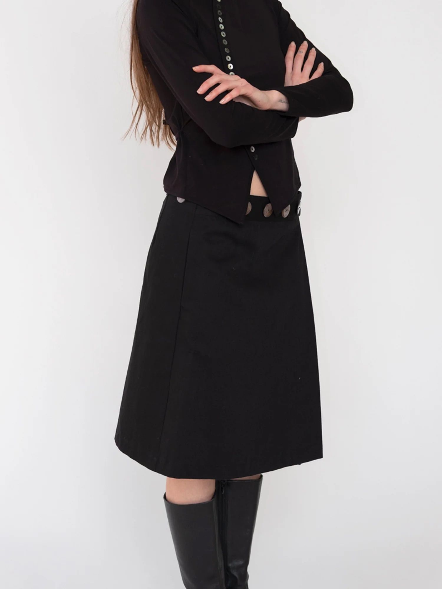 mid-length skirt with oversized mother of pearl buttons. the waist wraps and buttons forming a pleat. cotton twill, two pockets, tailored fit.