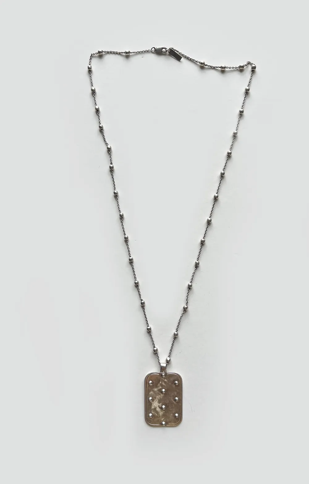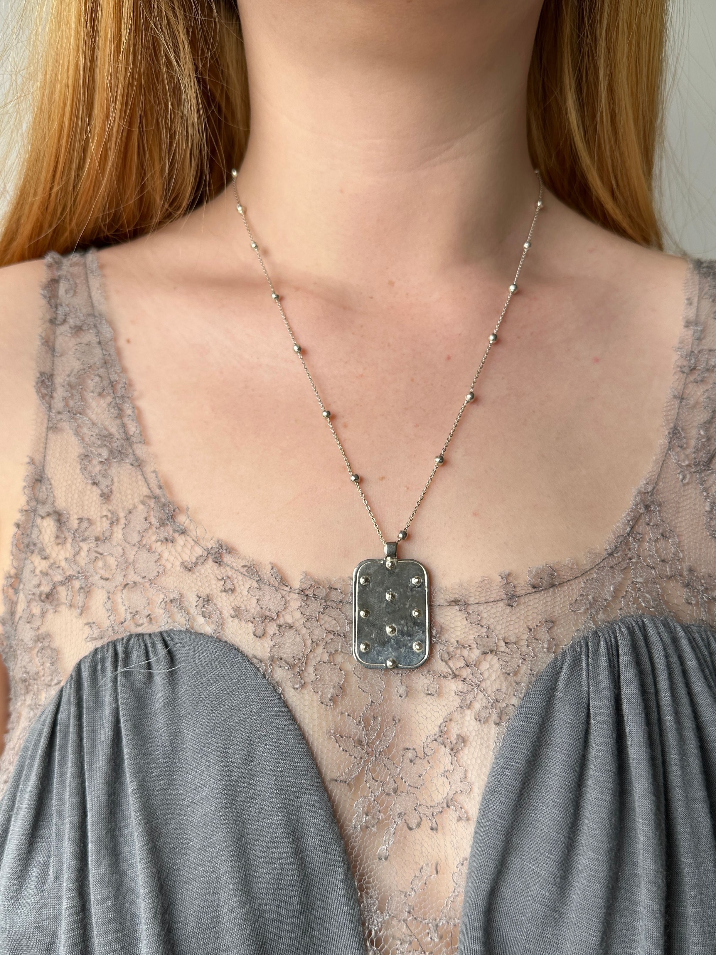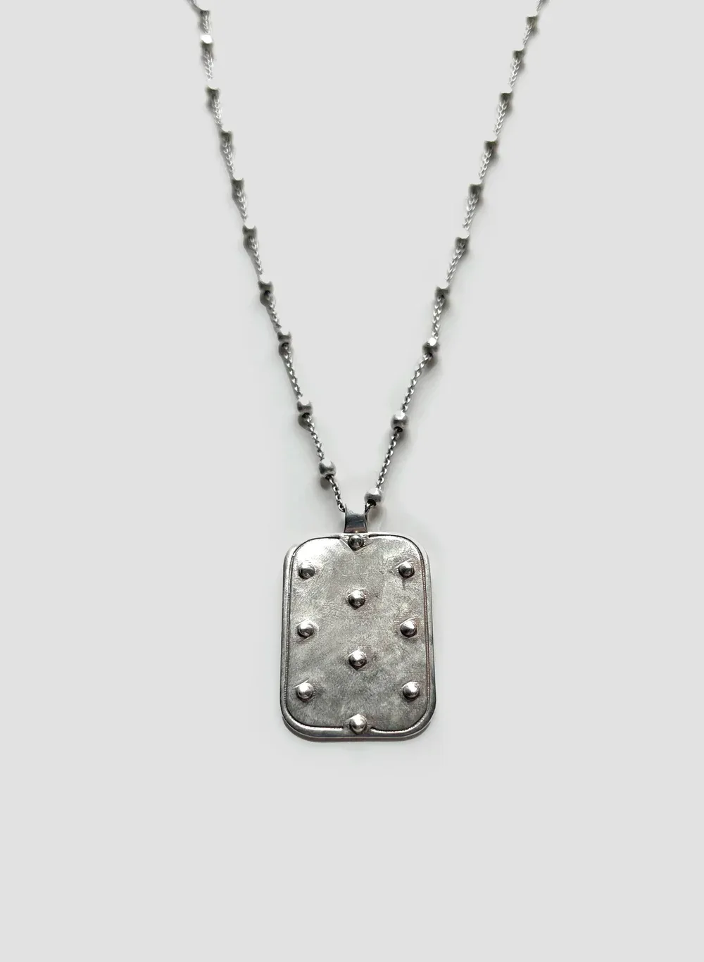 the tag necklace is cast from sterling silver. there are small raised dots on the front with an etched border. satellite chain, sits a little longer at 20” length.