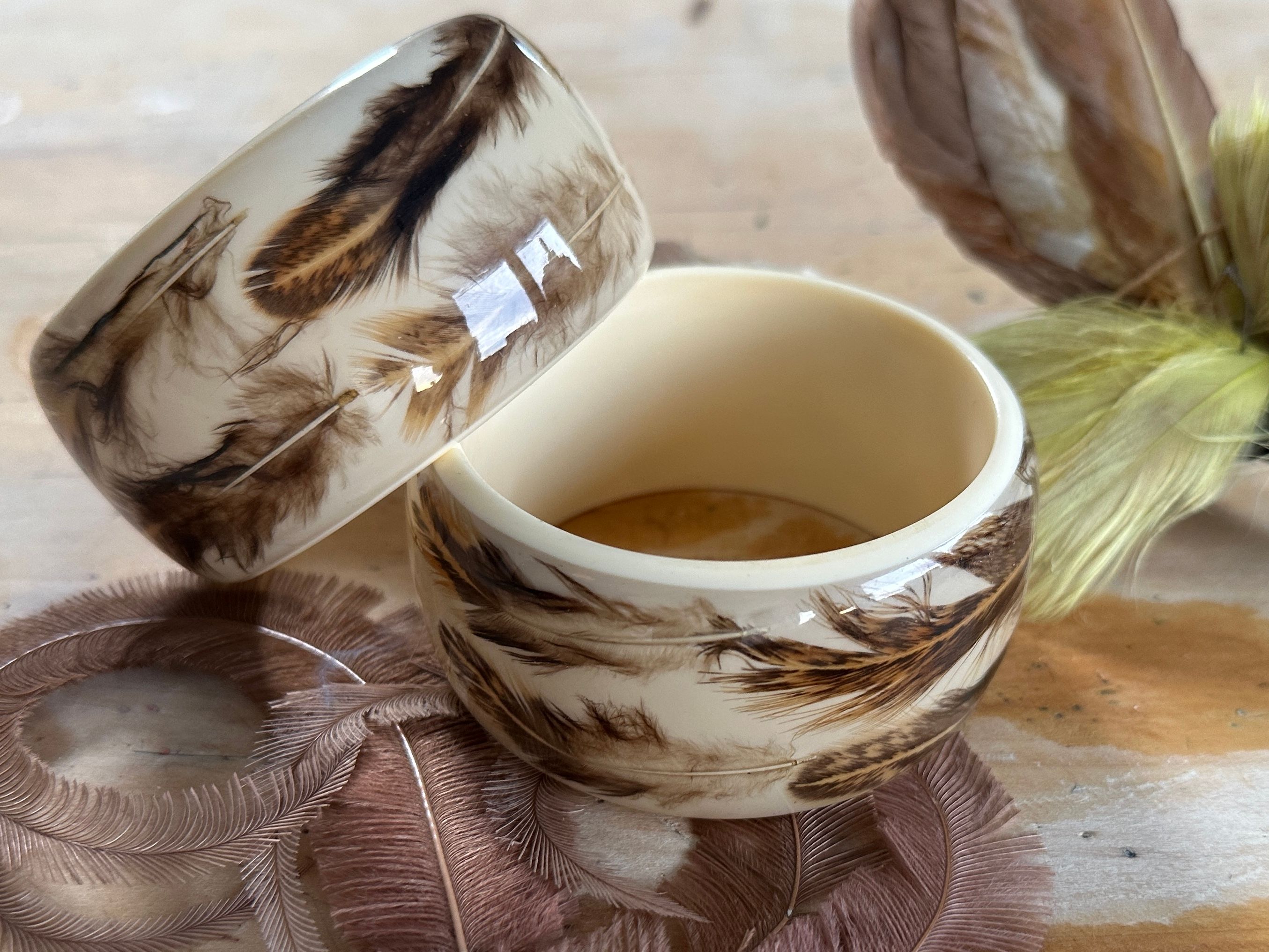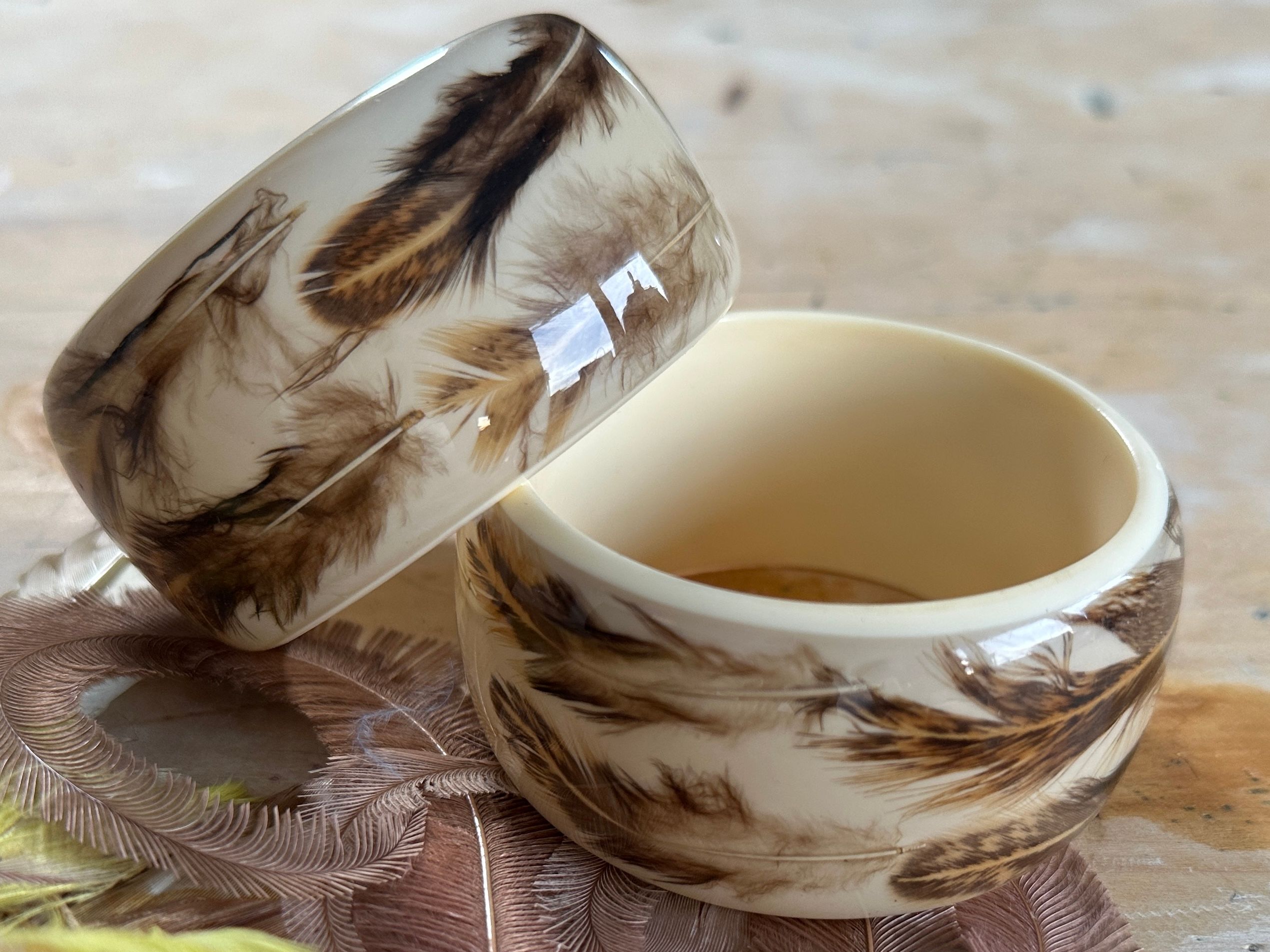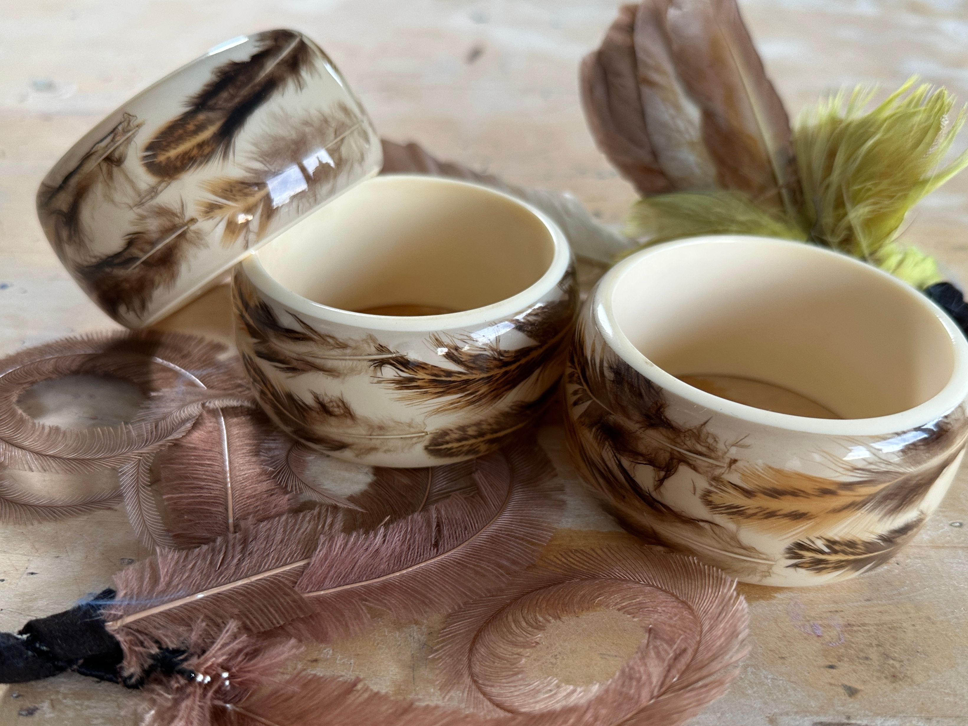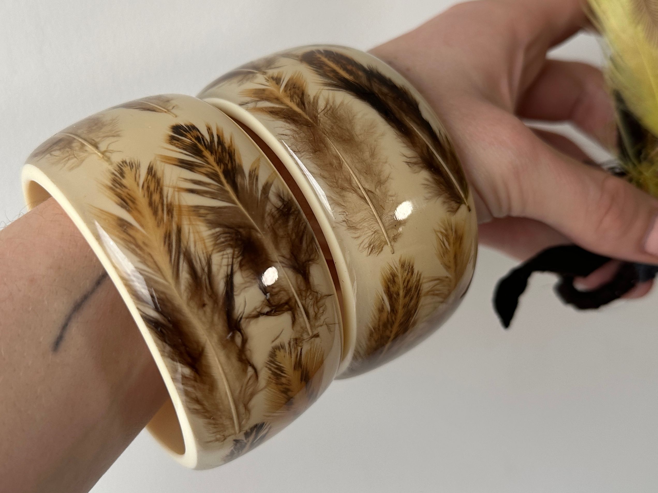 due to the nature of the materials, each bracelet will be unique, but the feathers are in the similar color pallet as the bracelets pictured.