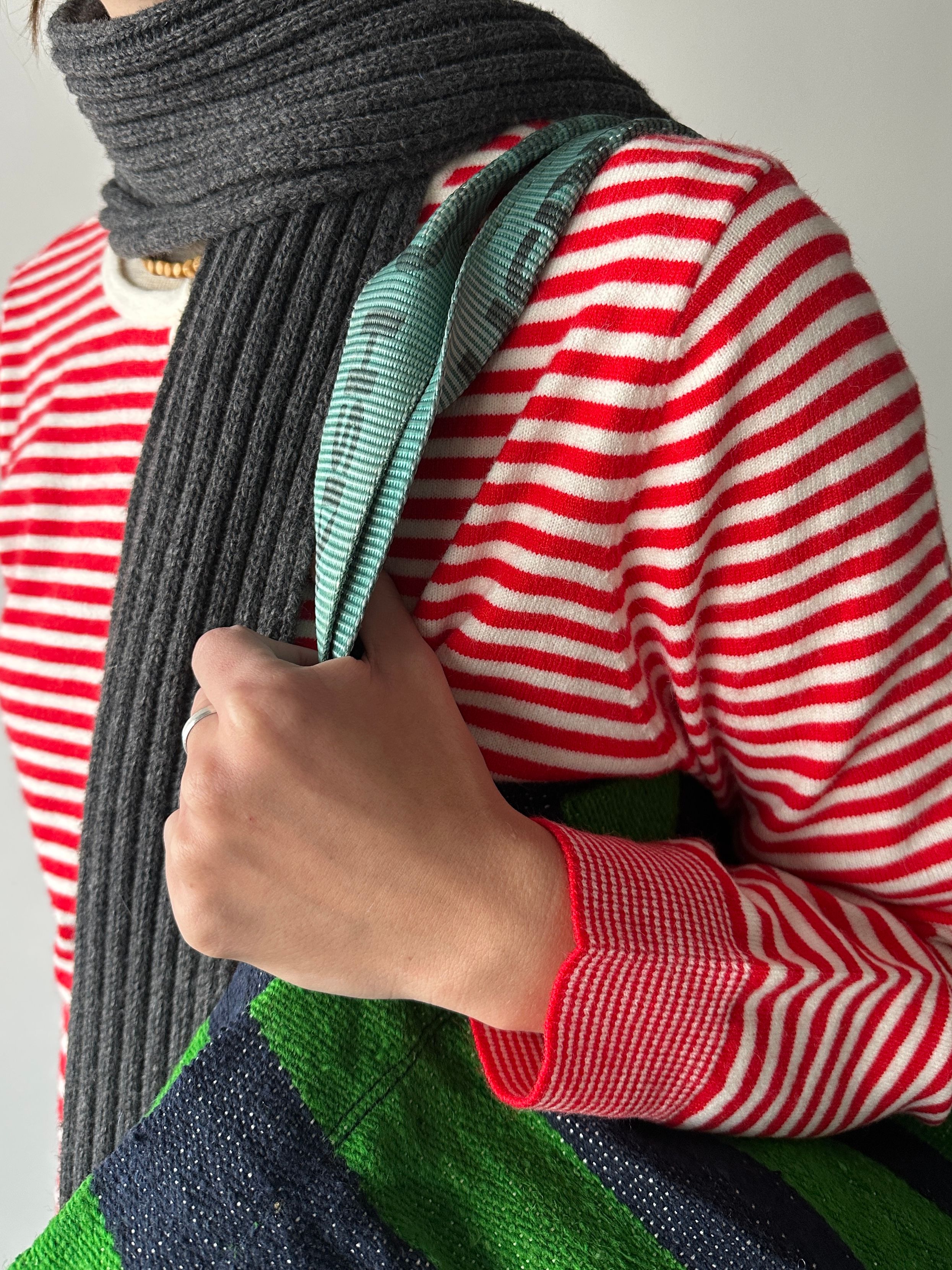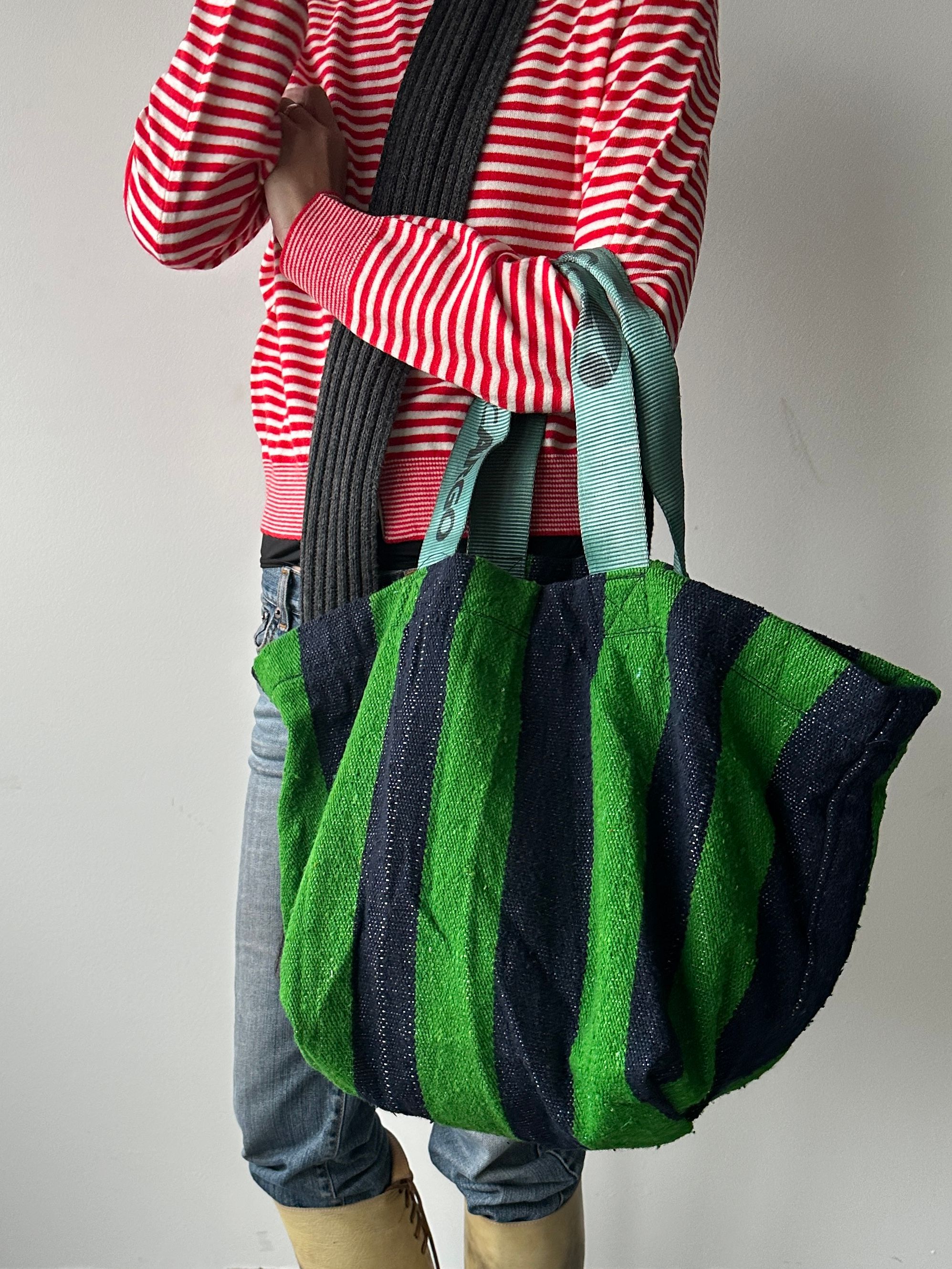 handle bag with drawstring interior closure made from repurposed rug materials and vintage military strap