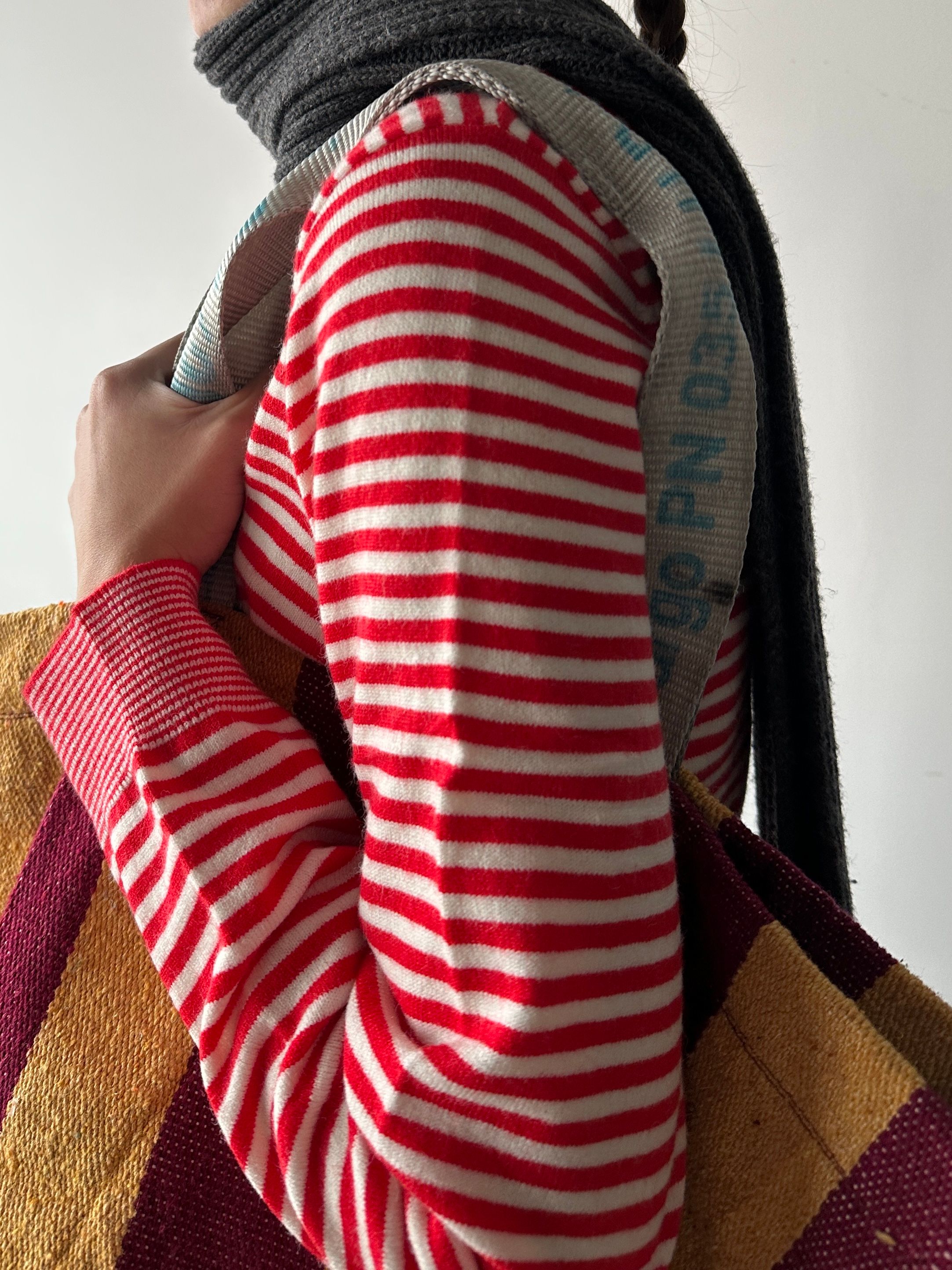 handle bag with drawstring interior closure made from repurposed rug materials and vintage military strap