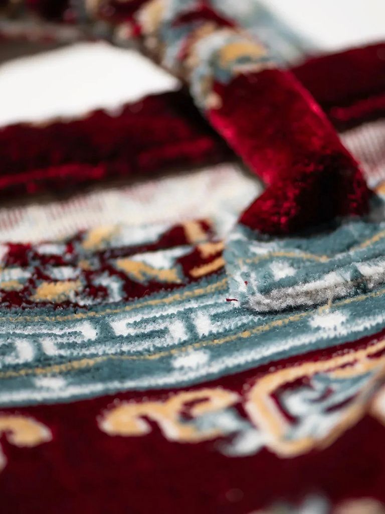 This unique rug bag is crafted from a repurposed rug, echoing the charm of 19th-century carpet bags that were once popular in Europe and America. Originally made from leftover materials, these bags served a dual purpose—storing travel essentials while keeping you cozy in unheated vehicles. Combining practicality with a touch of vintage flair, this bag will add character to any look.