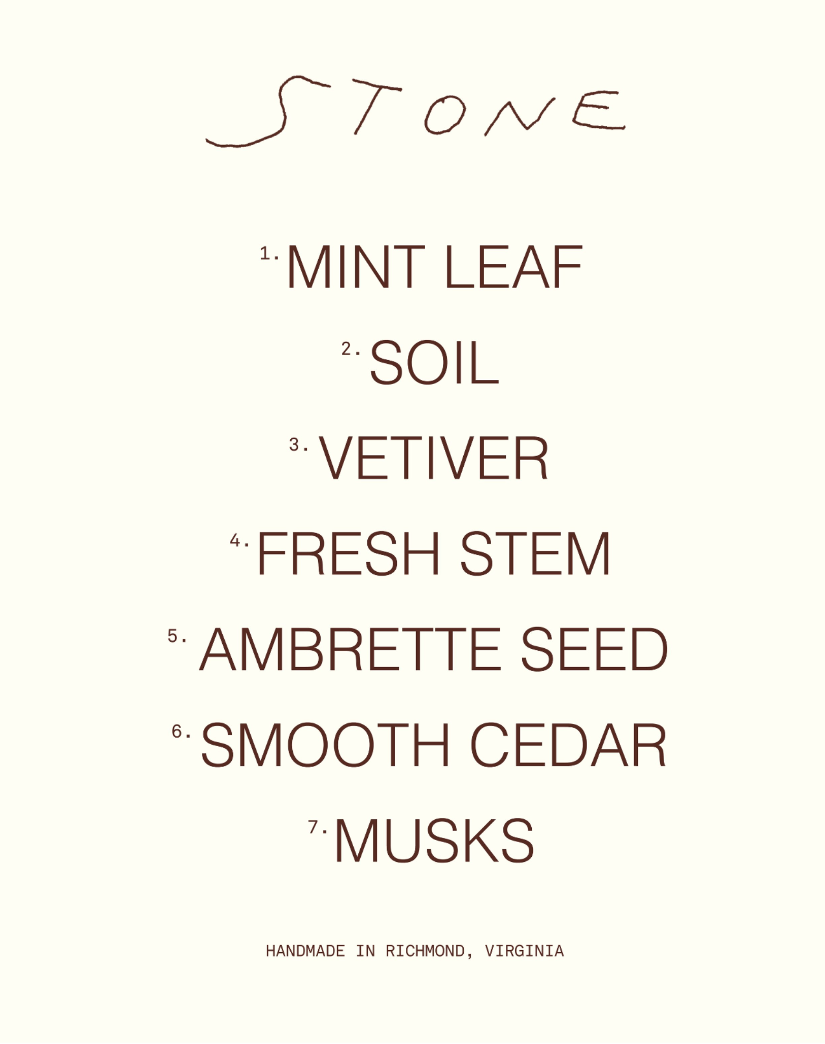 “Stone began as an exploration into the sensory experience of stonehood — immersed in earth and growth, smoothed and nurtured by time. I wanted to capture the birth and death of the world around this steadfast natural form. Making this practice encompassed many seasons of my life, which I feel is integral to my own personal experience of the scent. Mint leaf echoes moments of making in the studio during the winter. Crisp, sweet herbaceousness, which characterizes the top notes of stone, couples with the beginnings of fresh green growth into Spring. The heart brings it closer to the ground: dry, faintly smoky vetiver mingles with damp soil akin to petrichor. At last, Stone dries down to a smooth cedar and comforting musks: the feeling of a weathered stone in hand, somehow, by chance, fitting perfectly in the palm.”